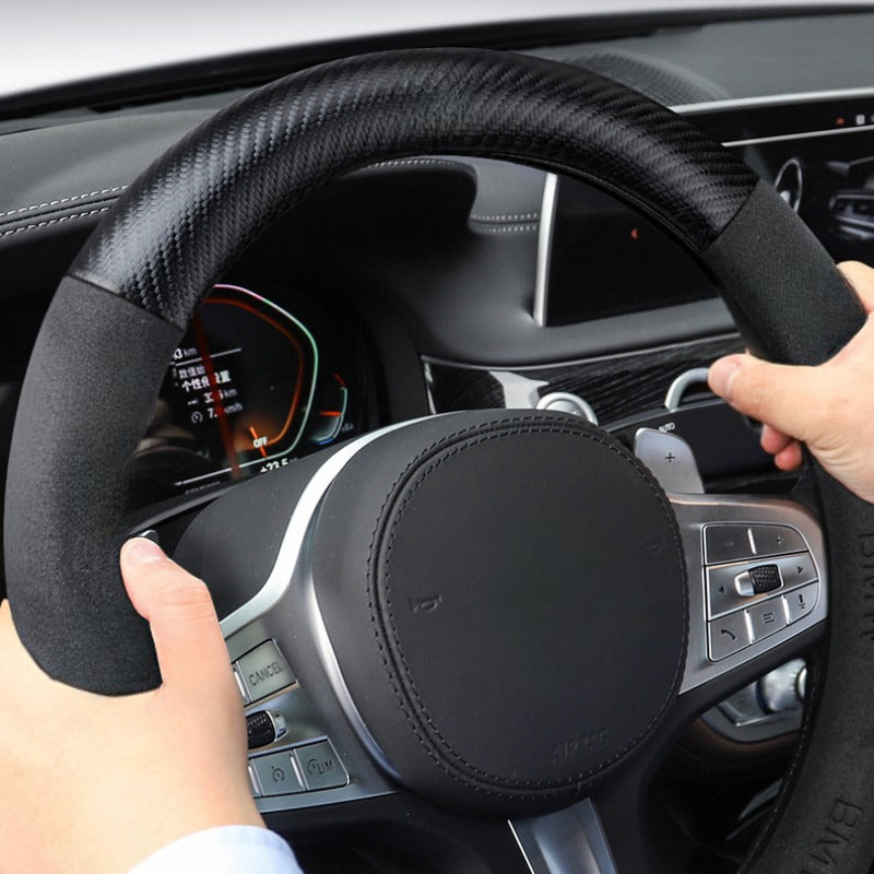 Elevate your driving adventure with the Anti Slip Steering Wheel Cover. Made from dense suede material, this cover offers comfort, durability, and style. The plush, non-pilling, and non-slip suede creates a luxurious, ideal for any season. Featuring a wear-resistant surface with a three-dimensional carbon fiber design, this cover adds sophistication to your vehicle and guarantees a steady hold for daring driving. The ultra-thin rubber inner ring with anti-slip lines ensures a secure fit, fighting wear and tear for unbeatable performance.
