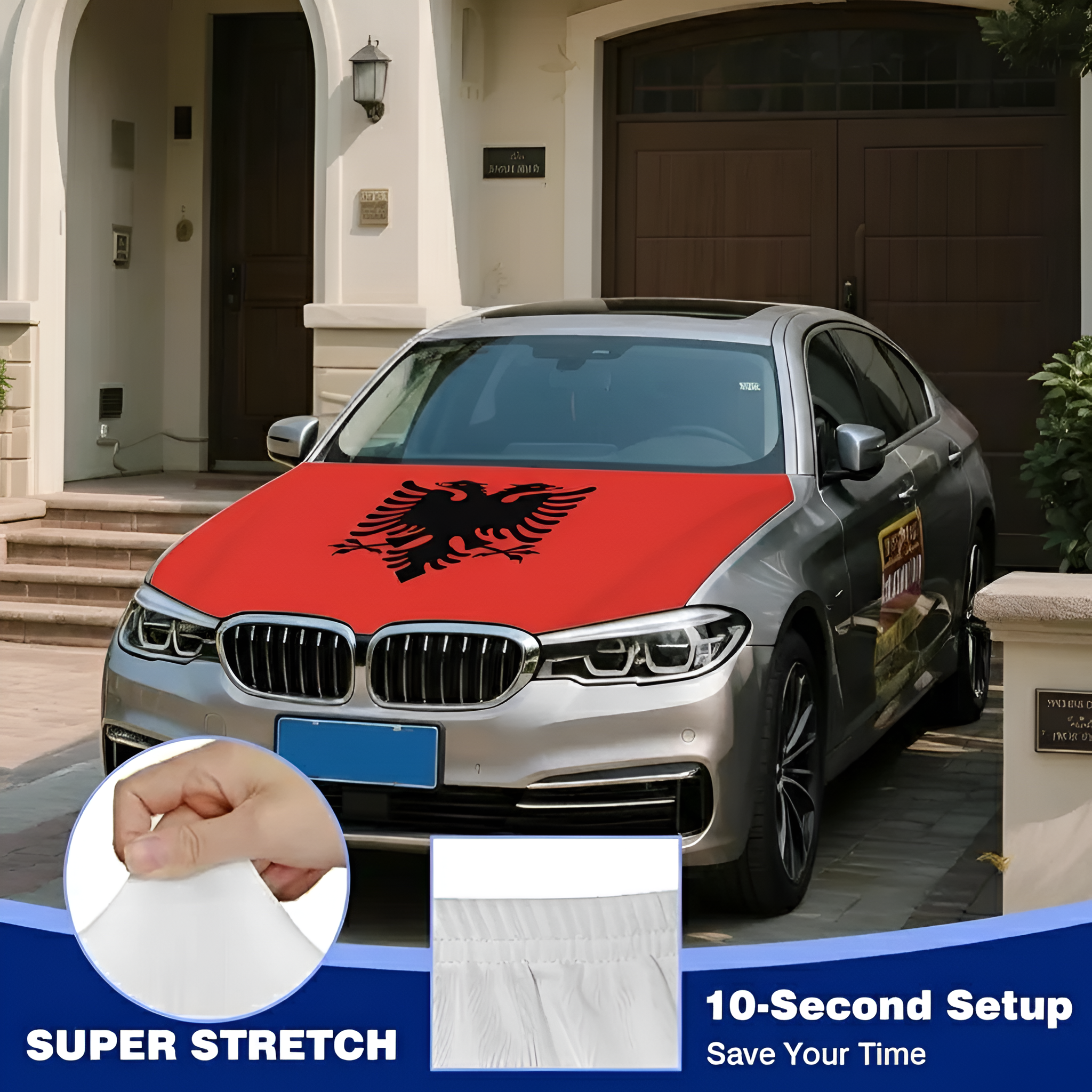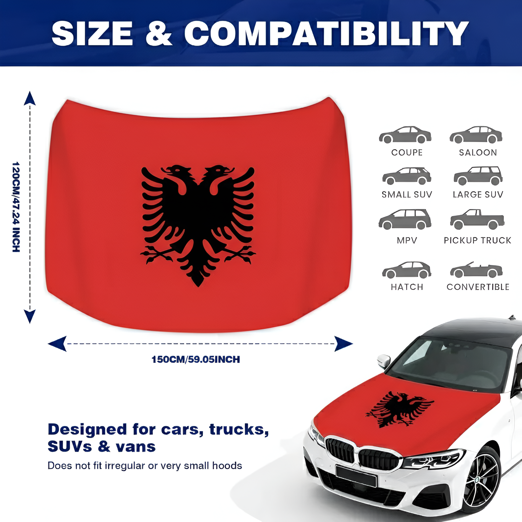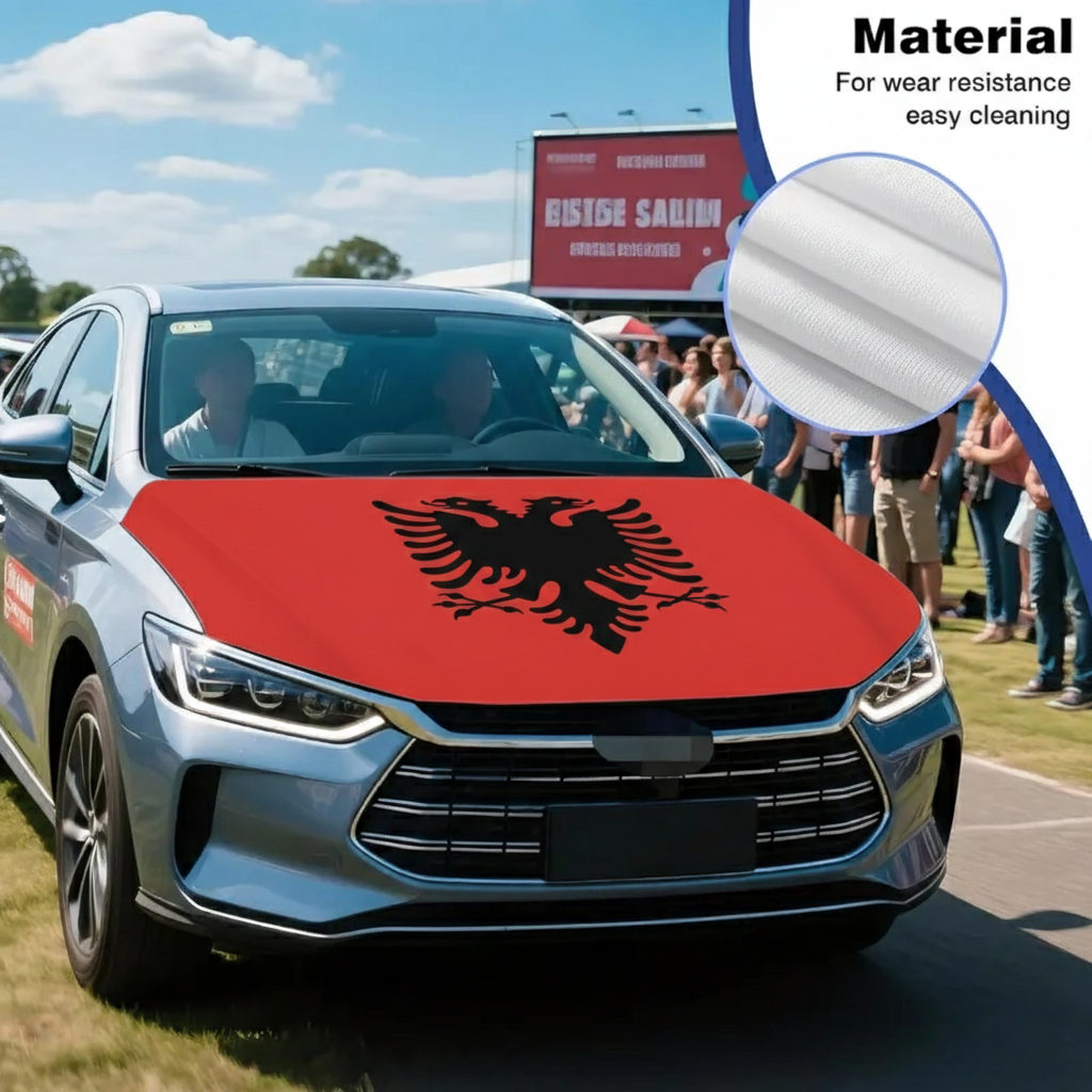 This Official FIFA 2026 Albania Flag Car Hood Cover is prepared to display the national flag design across the hood area while providing surface coverage during everyday driving. Measuring approximately 4 x 5 feet, the size supports compatibility with many cars, trucks, and SUVs. The cover is made from stretch polyester fabric that adapts to the hood shape and helps maintain a smooth appearance during regular vehicle use. The printed red and black design remains clearly visible across the fabric surface. The flexible material allows quick placement and removal while maintaining a stable position during normal driving conditions.