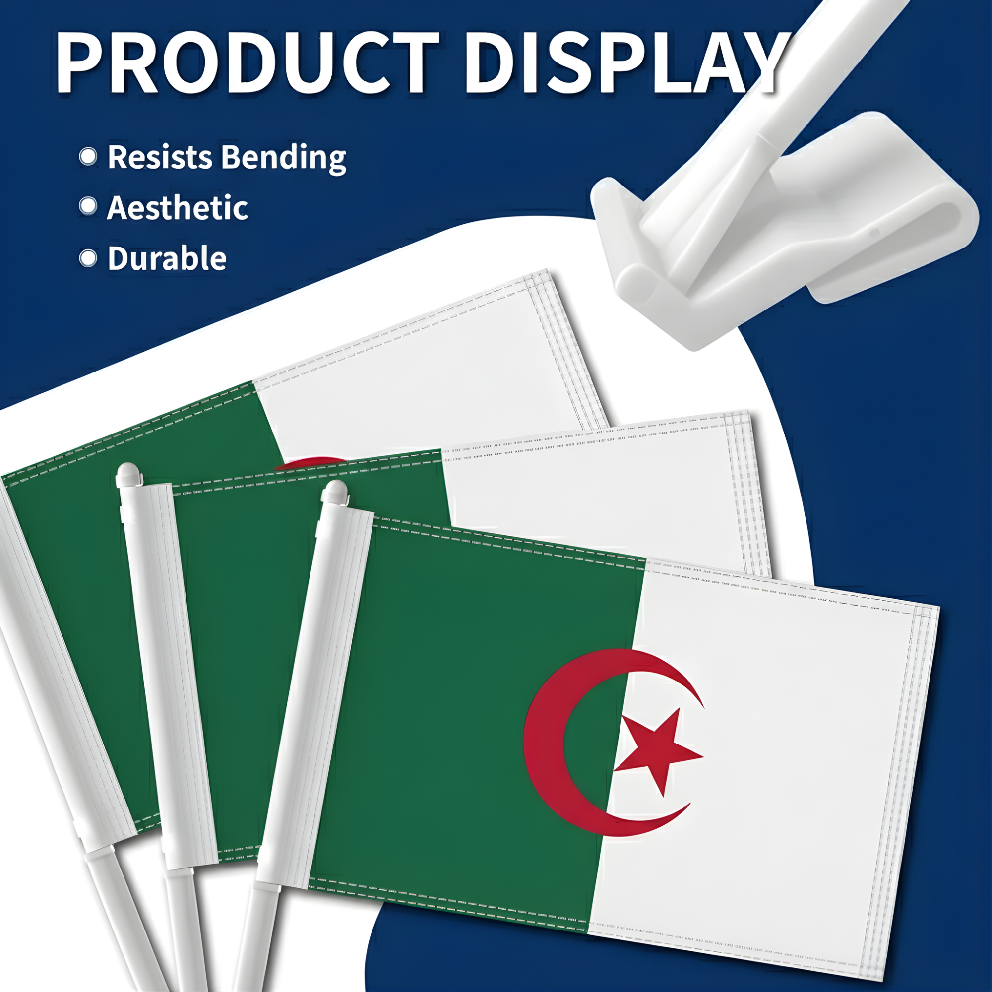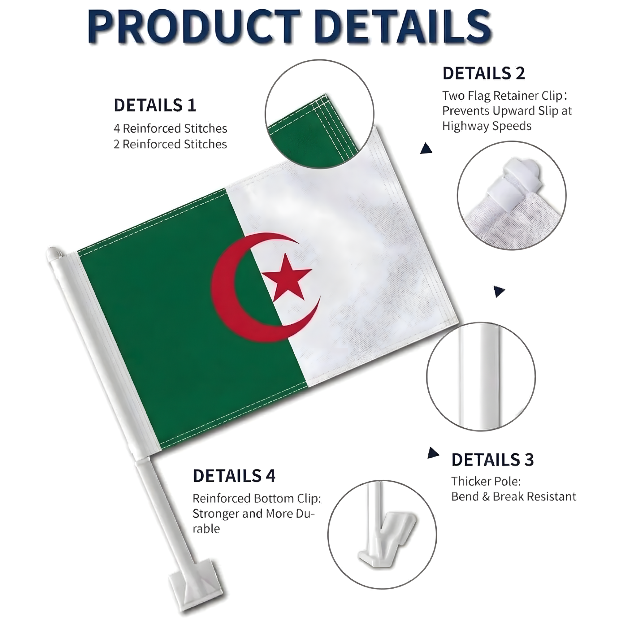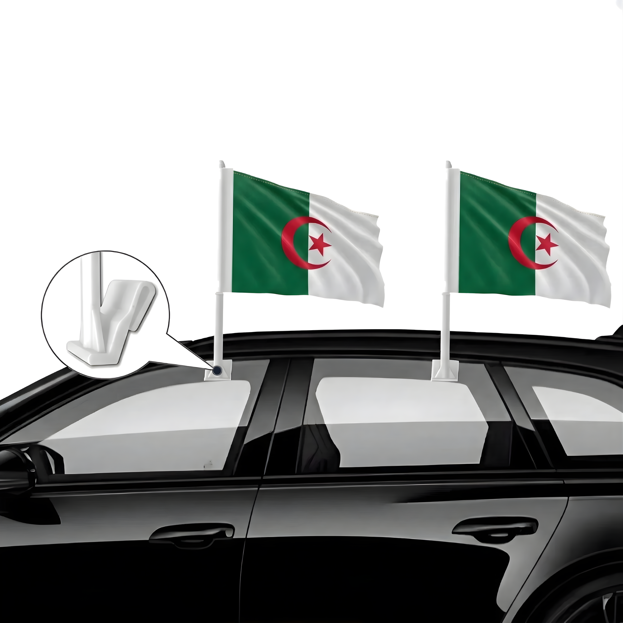 The Official FIFA 2026 Algeria Car Flag set is designed to display Algeria’s national colors while driving, attending parades, sporting events, or public celebrations. Each flag measures 11 x 17 inches and mounts to vehicle windows to create a noticeable display during travel.