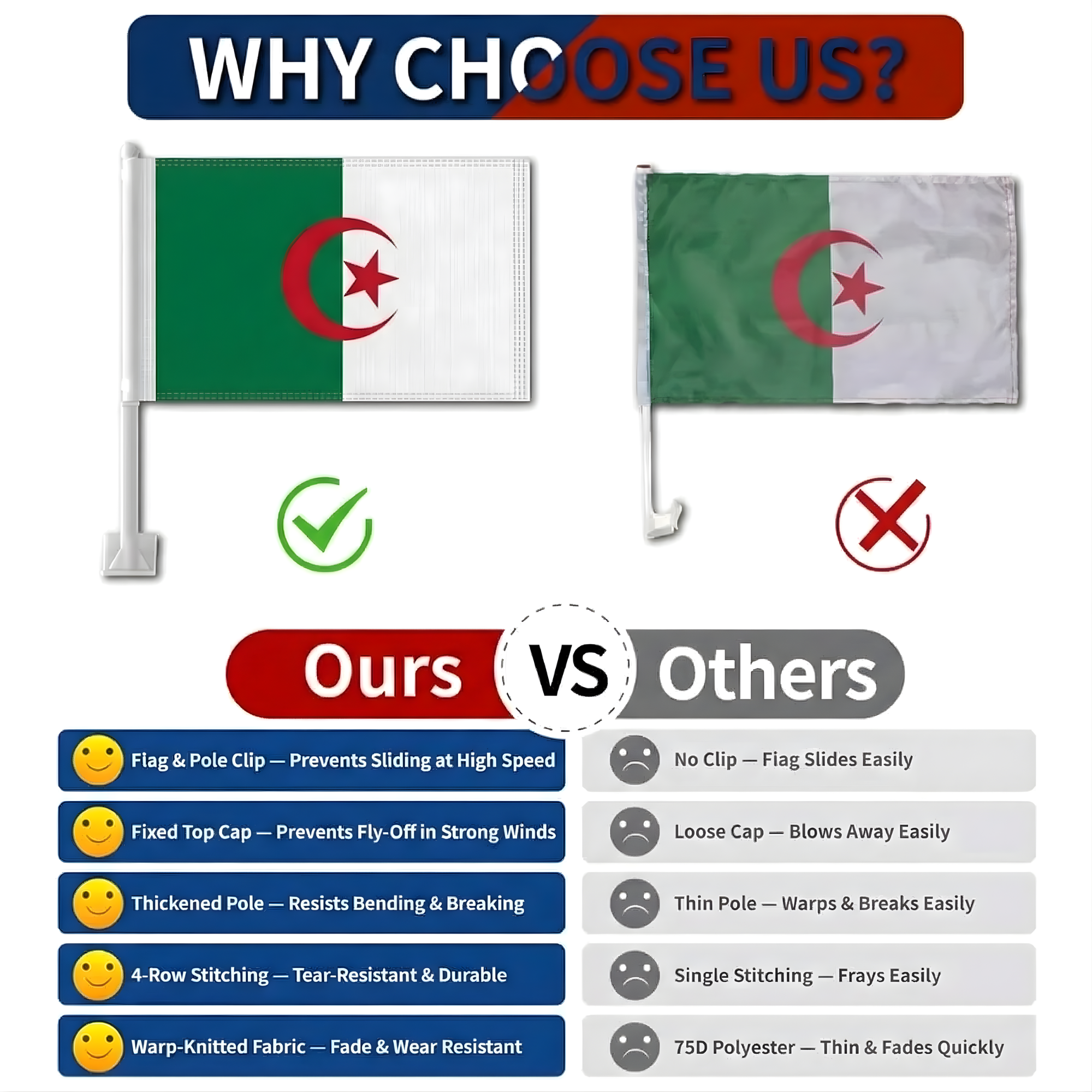 A reinforced window clip system allows quick placement without tools. The thicker support pole helps maintain steady positioning while driving, creating a neat vehicle display. Suitable for cars, SUVs, and trucks, this flag set provides a practical decorative option for events and everyday driving.