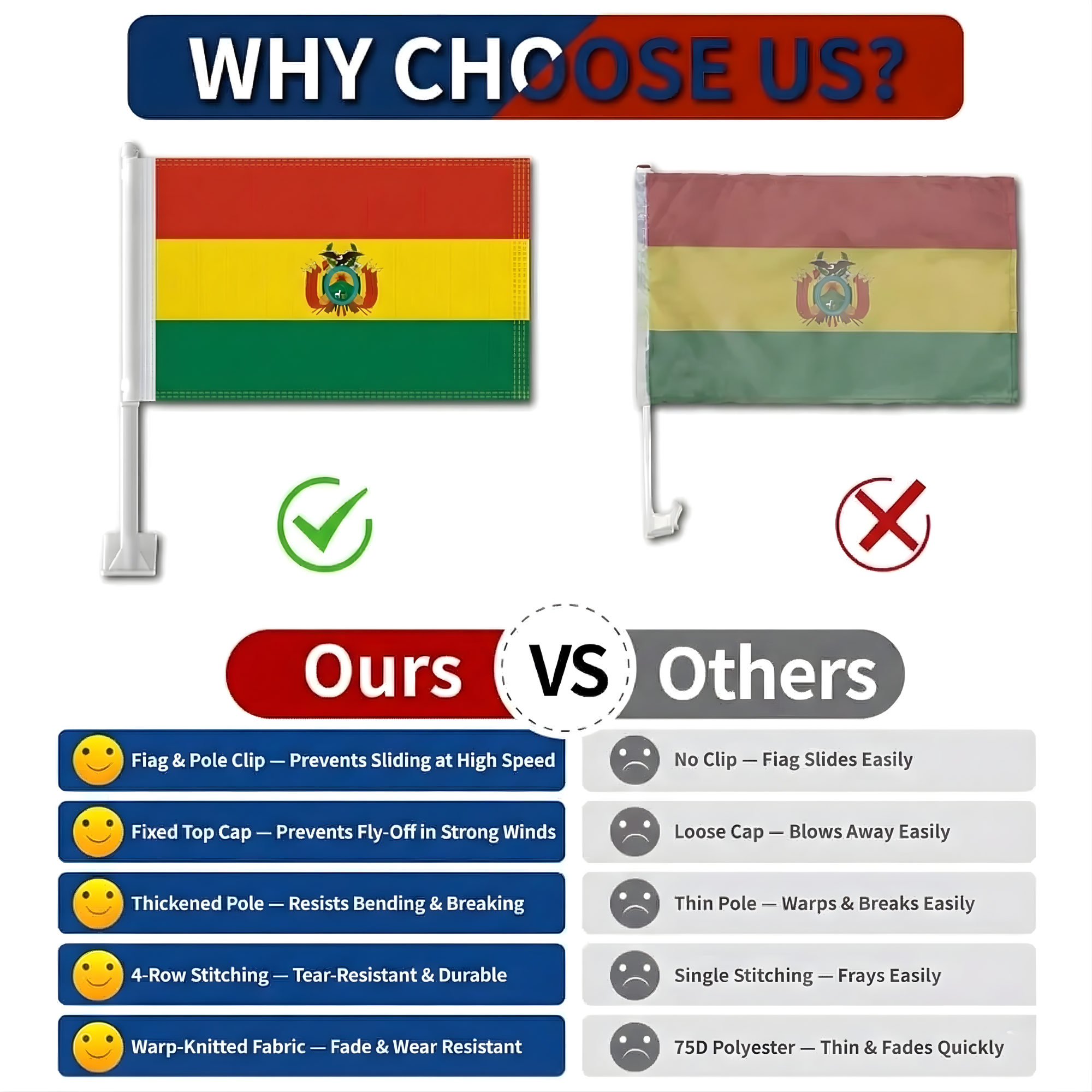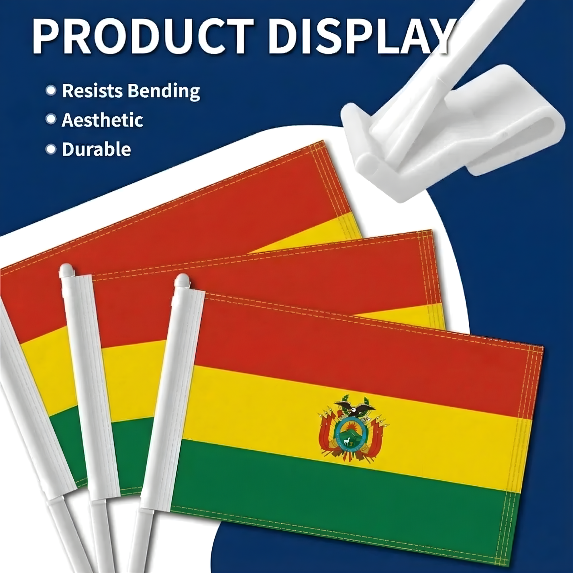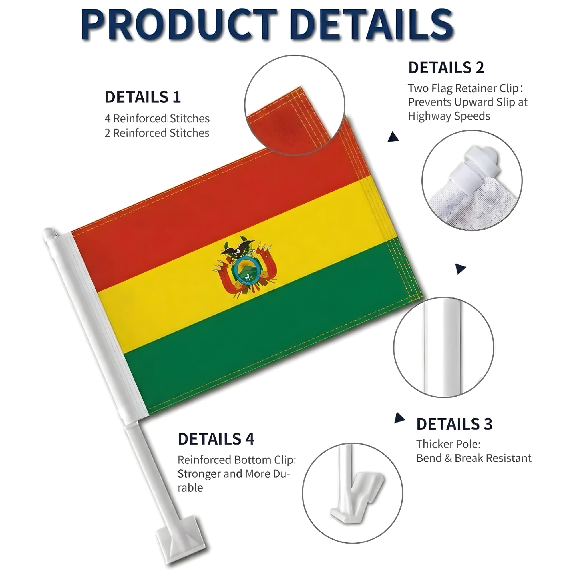 This set of two Official FIFA 2026 Bolivia Car Flag, sized 11 x 17 inches each, is designed for displaying national pride during daily driving, parades, sporting events, and patriotic celebrations. Made from two-layer warp-knit polyester, the fabric provides added structure compared to standard lightweight materials. The double-sided printing ensures the red, yellow, and green tricolor appears clear and correctly oriented from both directions. Built to handle road wind and changing weather conditions, the construction supports reliable outdoor display. A reinforced window clip system allows stable attachment without tools, making installation quick and convenient.