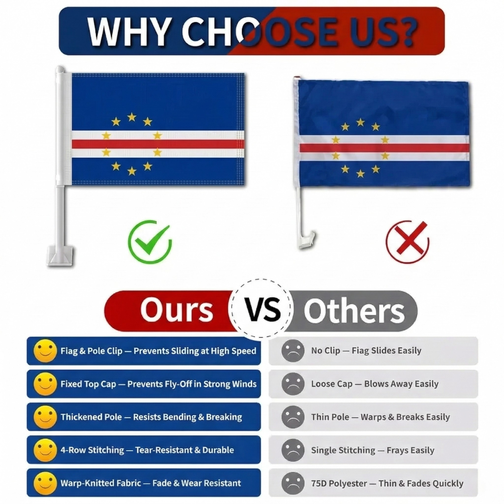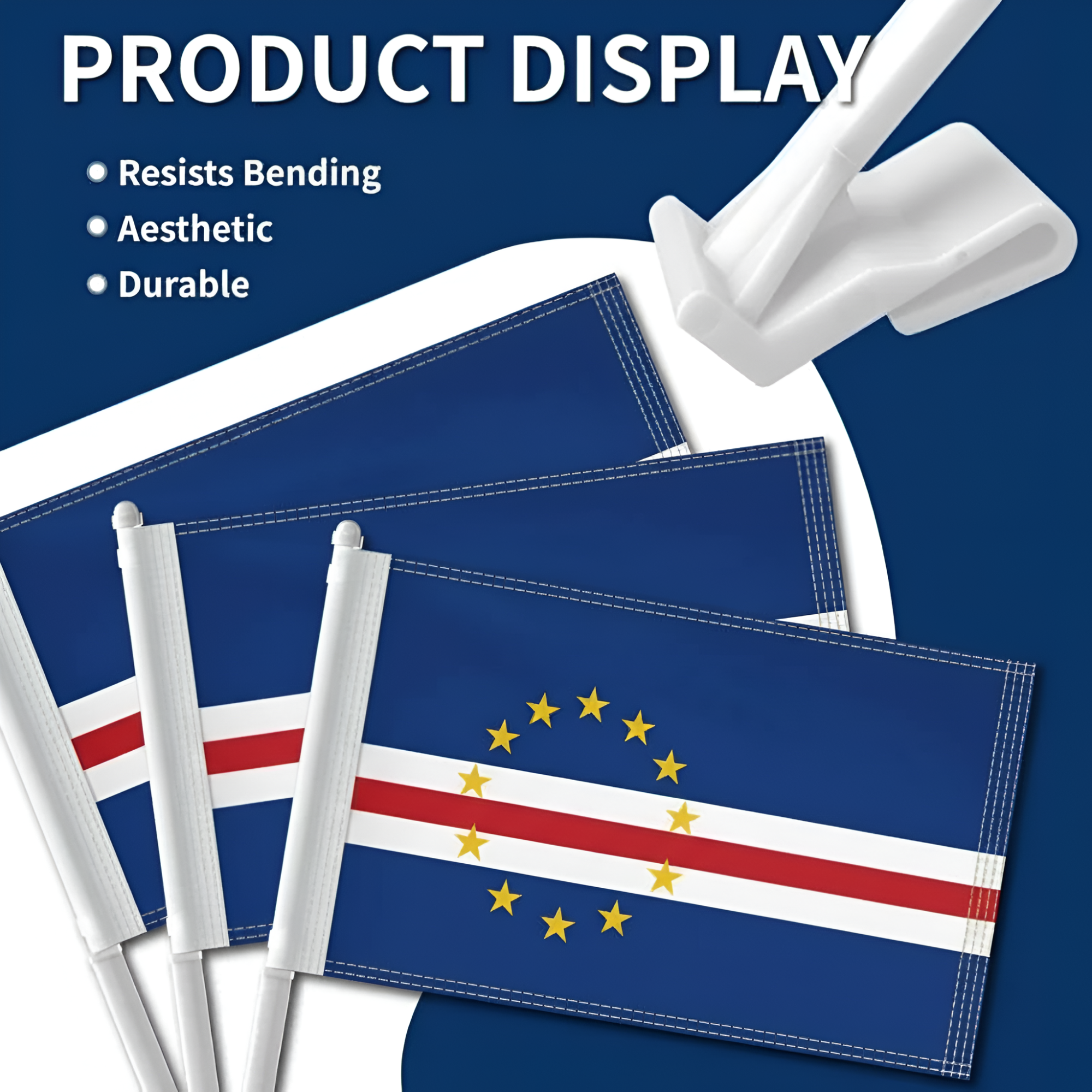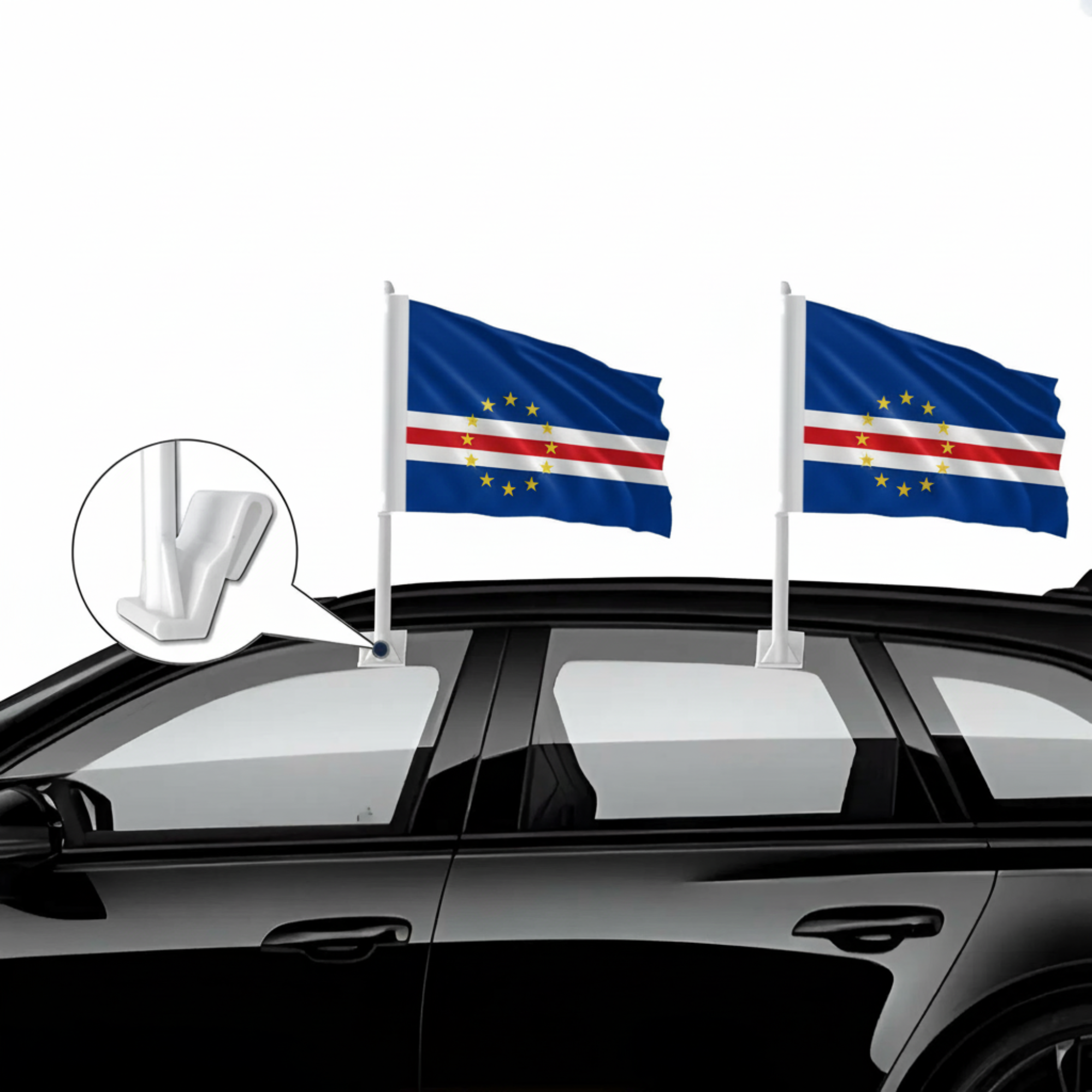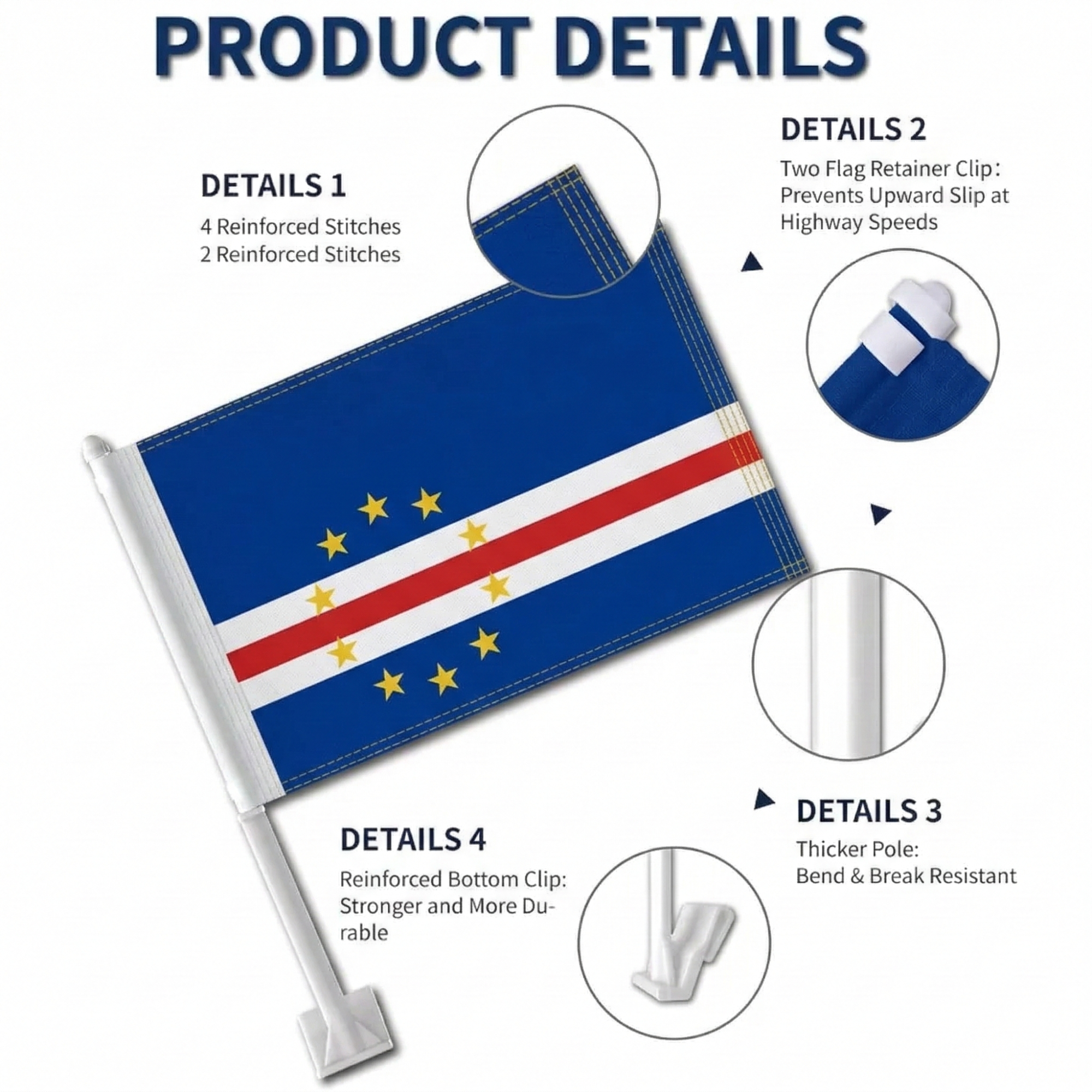 This set of two Official FIFA 2026 Cape Verde Car Flag, sized 11 × 17 inches each, is designed for vehicle display during driving, parades, sporting events, and national celebrations. Made from two-layer warp-knit polyester, the fabric structure provides added strength compared with standard lightweight materials. The double-sided printing allows the blue field with white and red stripes and yellow stars to appear clearly from both directions. The construction supports outdoor display during wind and changing weather conditions. A reinforced window clip mounting system allows stable attachment without tools, while the support pole helps maintain position while the vehicle is in motion. Suitable for cars, SUVs, and trucks, this compact flag set works for both events and everyday vehicle decoration.