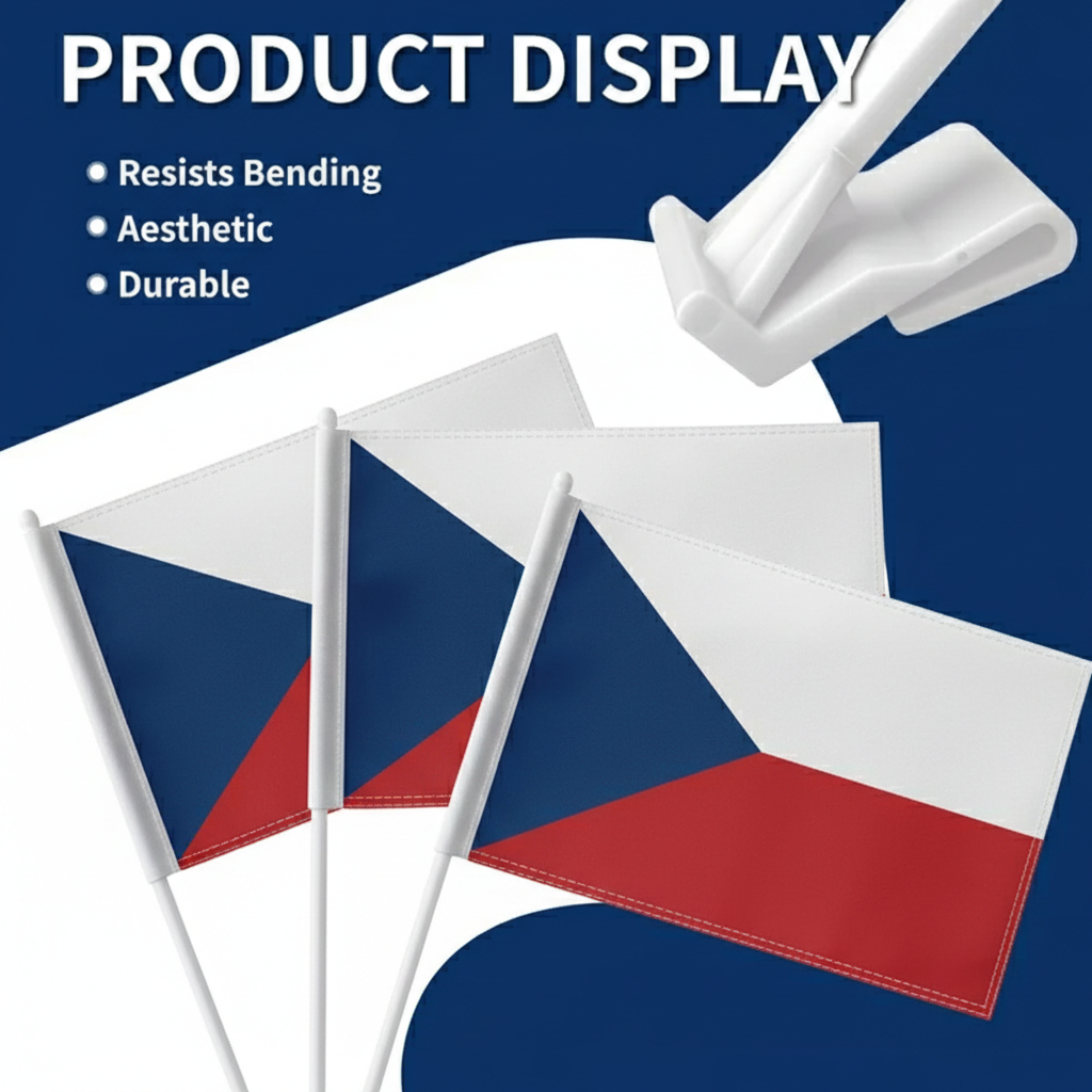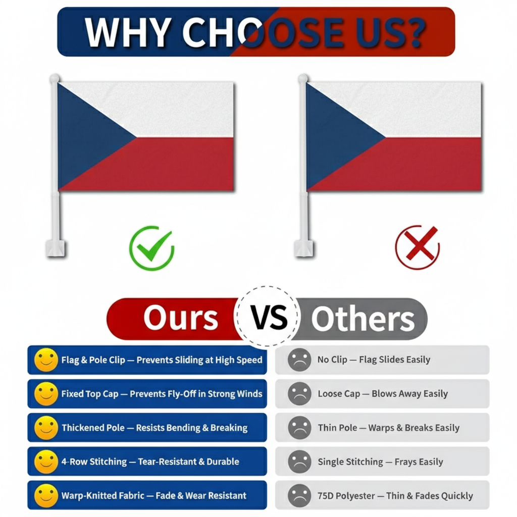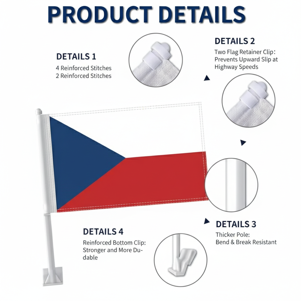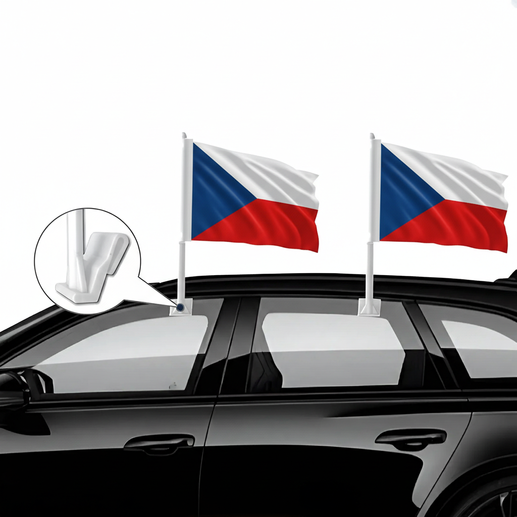 This set of two Official FIFA 2026 Czech Republic Car Flags, sized 11 x 17 inches each, is created for displaying national pride while driving during tournaments, parades, sporting events, and patriotic celebrations. The flags are made from two layer warp knit polyester fabric, offering improved structure compared with thin standard flag materials. Double sided printing allows the red, white, and blue design of the Czech Republic flag to appear clearly and correctly oriented from both directions. Designed for use on moving vehicles, the construction supports display in road wind and varying outdoor weather conditions. A reinforced window clip mounting system allows the flags to be attached to vehicle windows without the need for tools. The thicker support pole helps keep the flag positioned properly while driving, maintaining a balanced appearance. Suitable for cars, SUVs, and trucks, this compact flag set provides a practical way to display national colors during events and everyday driving.