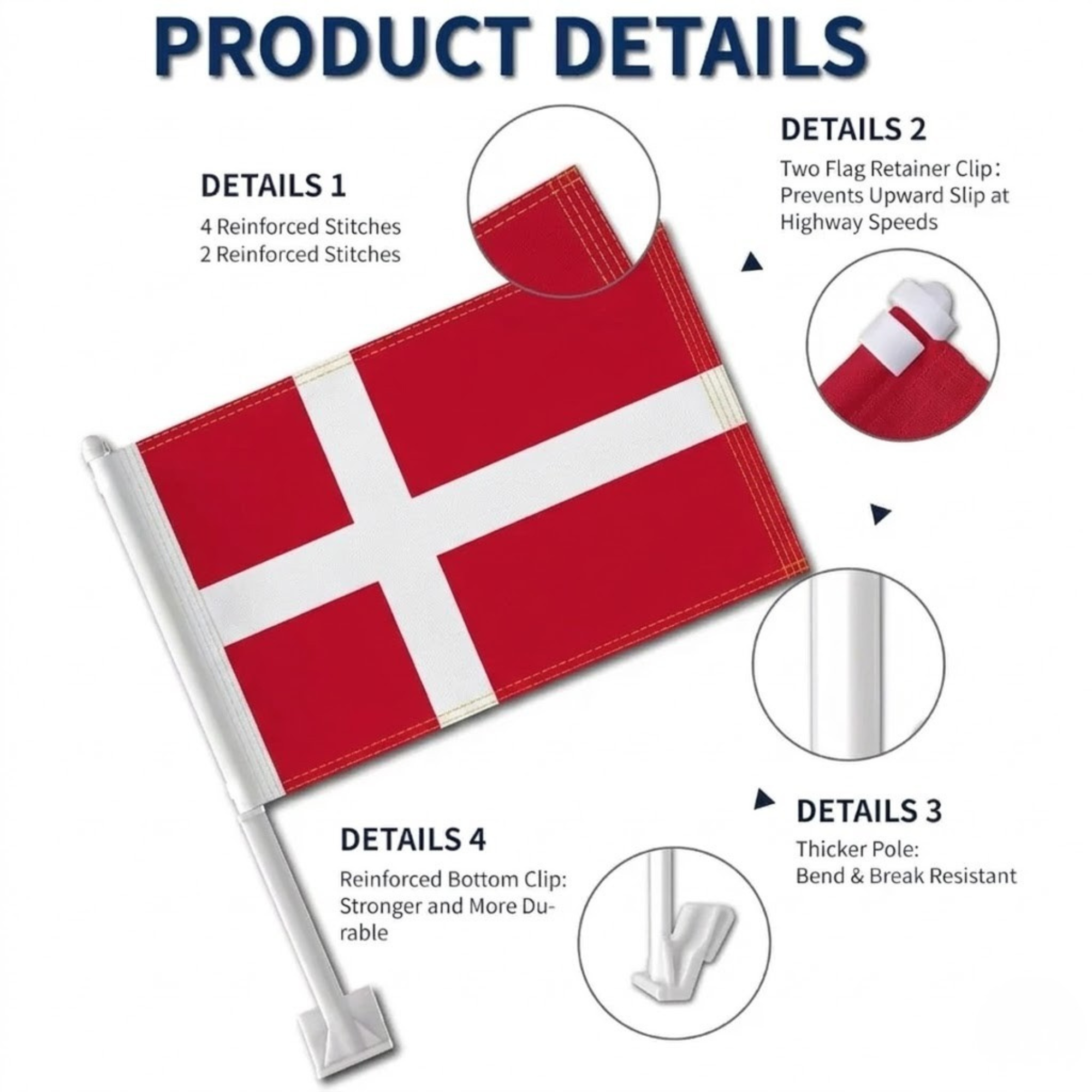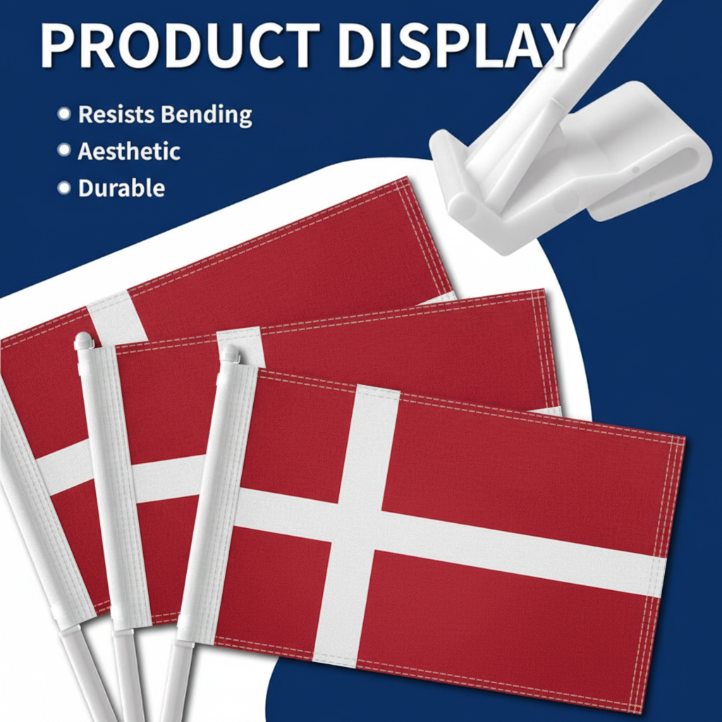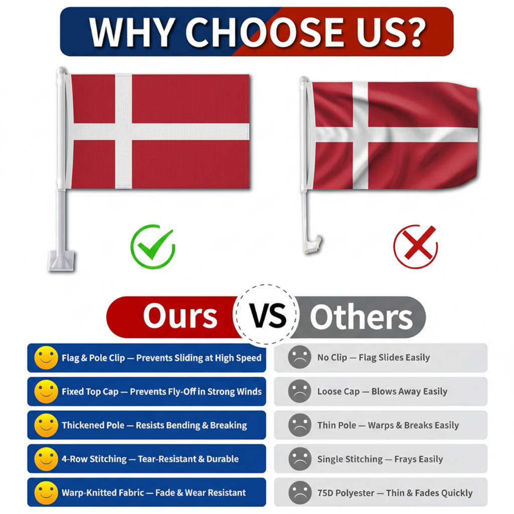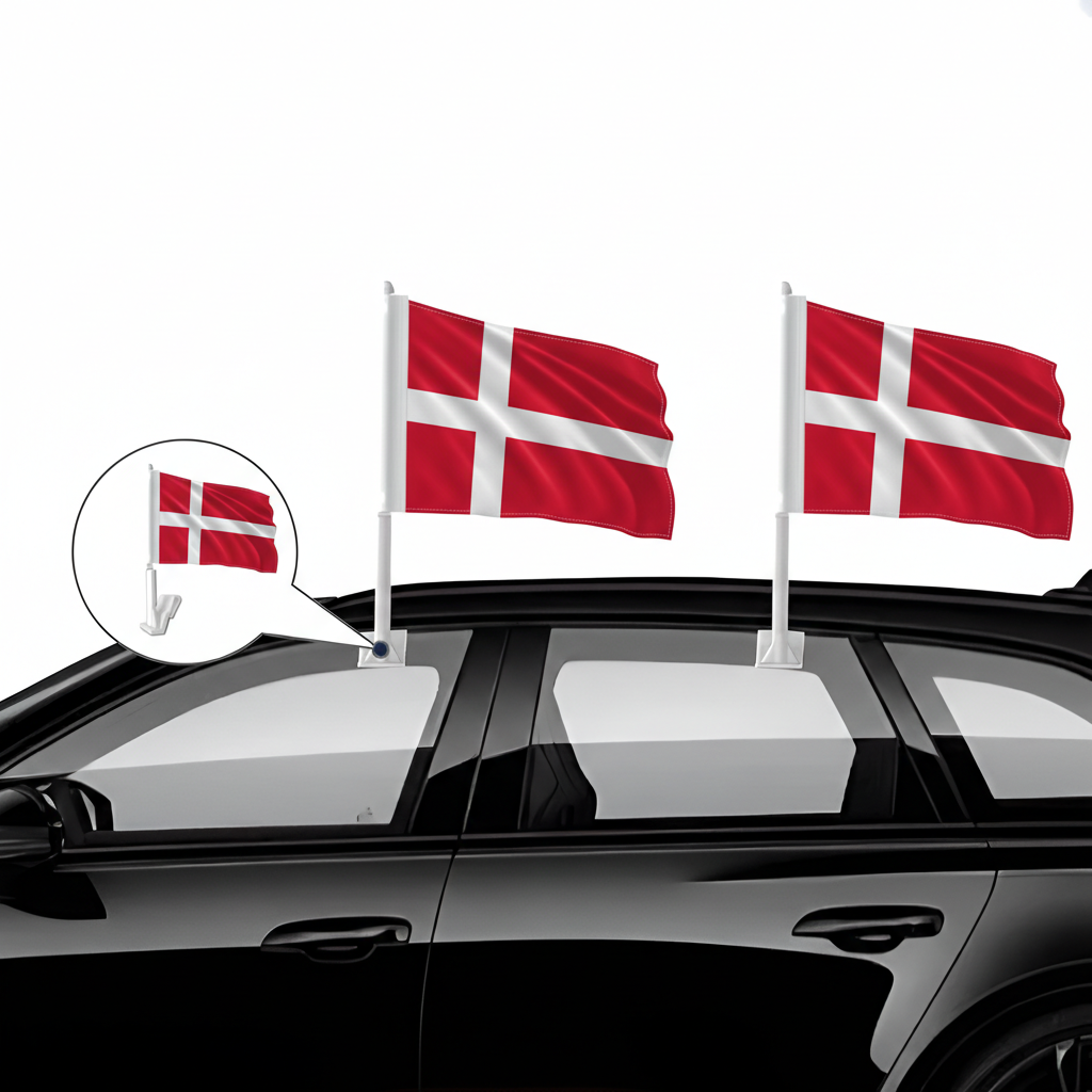 This set of two Official FIFA 2026 Denmark Car Flags, each measuring 11 x 17 inches, is created for showcasing national pride while driving during football tournaments, parades, sporting gatherings, and patriotic occasions. Manufactured from two-layer warp-knit polyester, the fabric provides stronger structure compared with thin, lightweight flag materials. The double-sided printing allows the white Nordic cross and red background of the Denmark flag to appear clear and properly oriented from both viewing directions. Designed for road travel, the construction helps the flag perform in wind and varying outdoor weather conditions. A reinforced window clip mounting system allows quick attachment to vehicle windows without the need for tools. The thicker support pole assists in maintaining stable positioning while driving, helping the flag remain properly displayed. Suitable for cars, SUVs, and trucks, this compact flag set offers practical display for both event celebrations and everyday vehicle decoration.