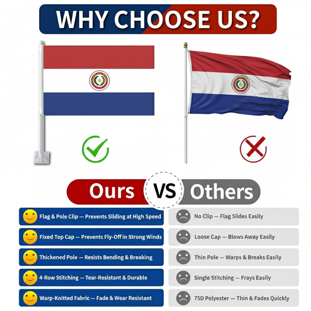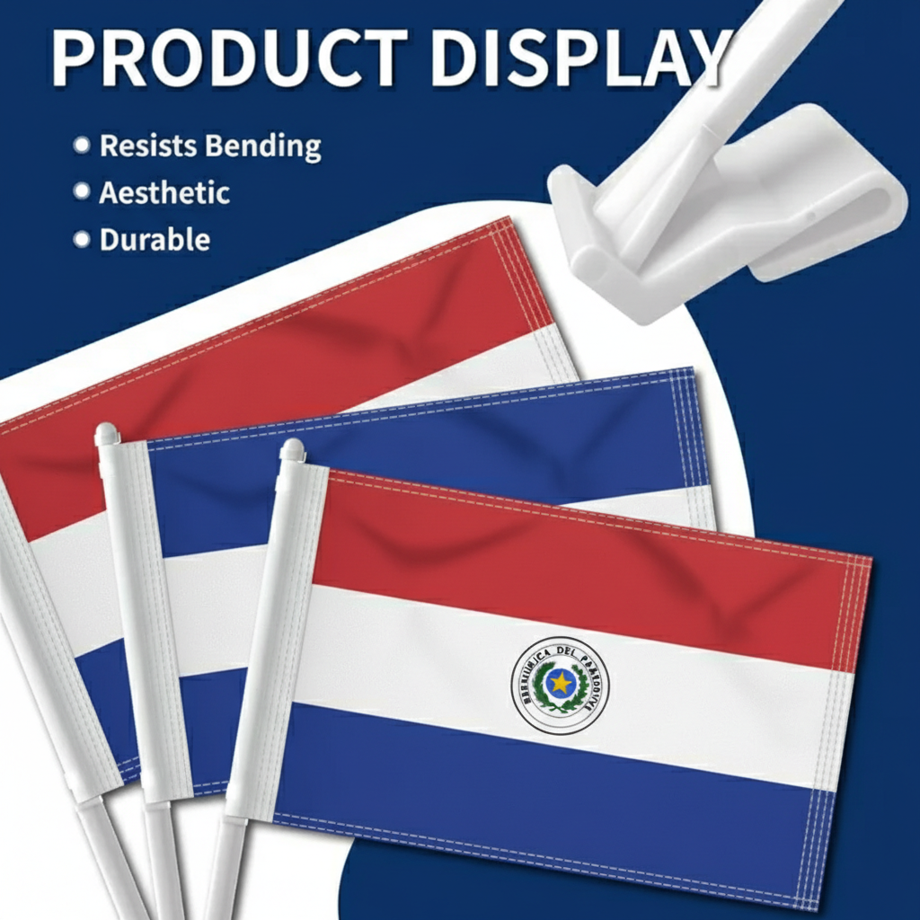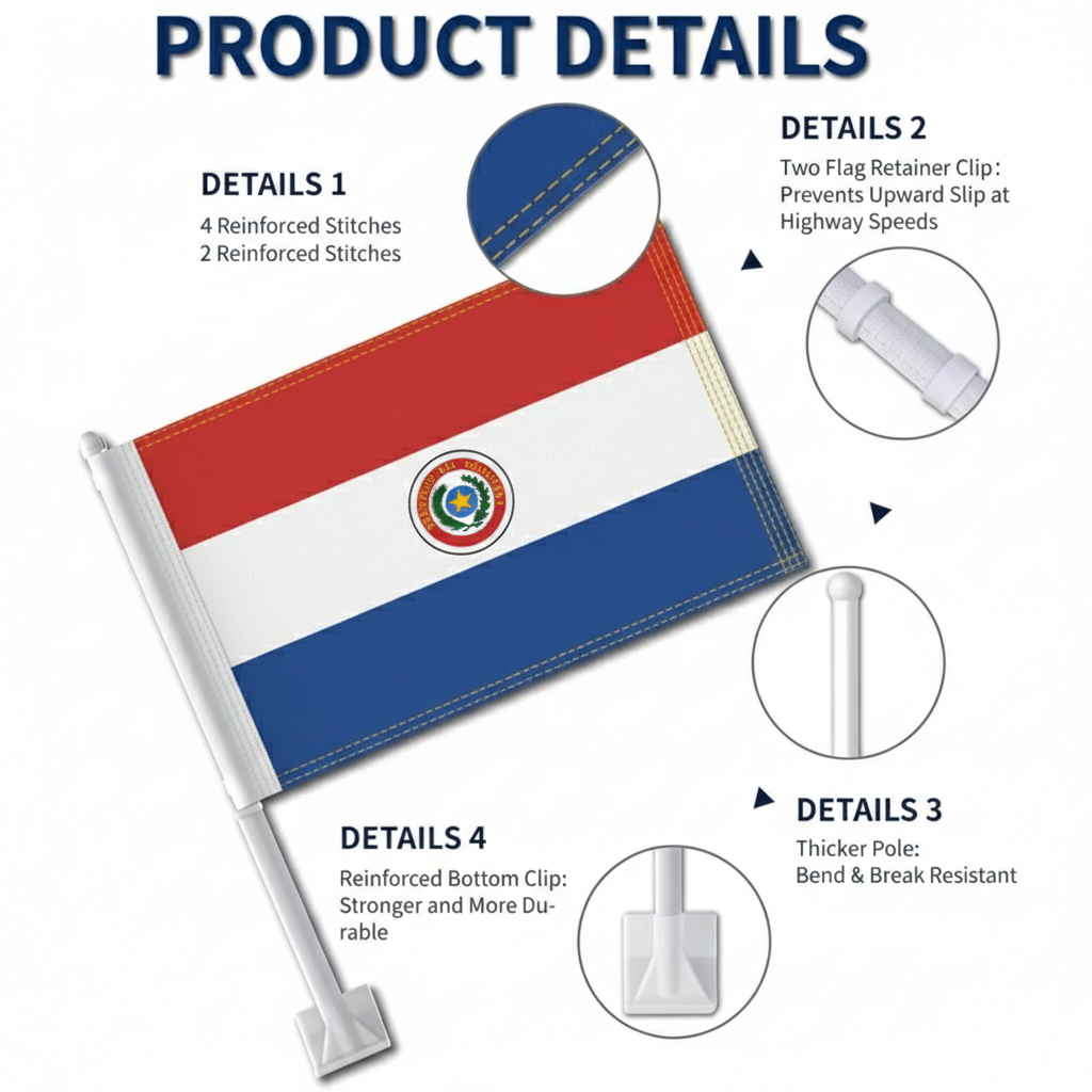 A reinforced window clip mounting system allows quick attachment to vehicle windows without the need for tools. The thicker support pole helps the flag remain properly positioned while the vehicle is in motion, maintaining a balanced appearance. Suitable for cars, SUVs, and trucks, this flag set offers a practical display format for national events, sports tournaments, and everyday vehicle decoration.