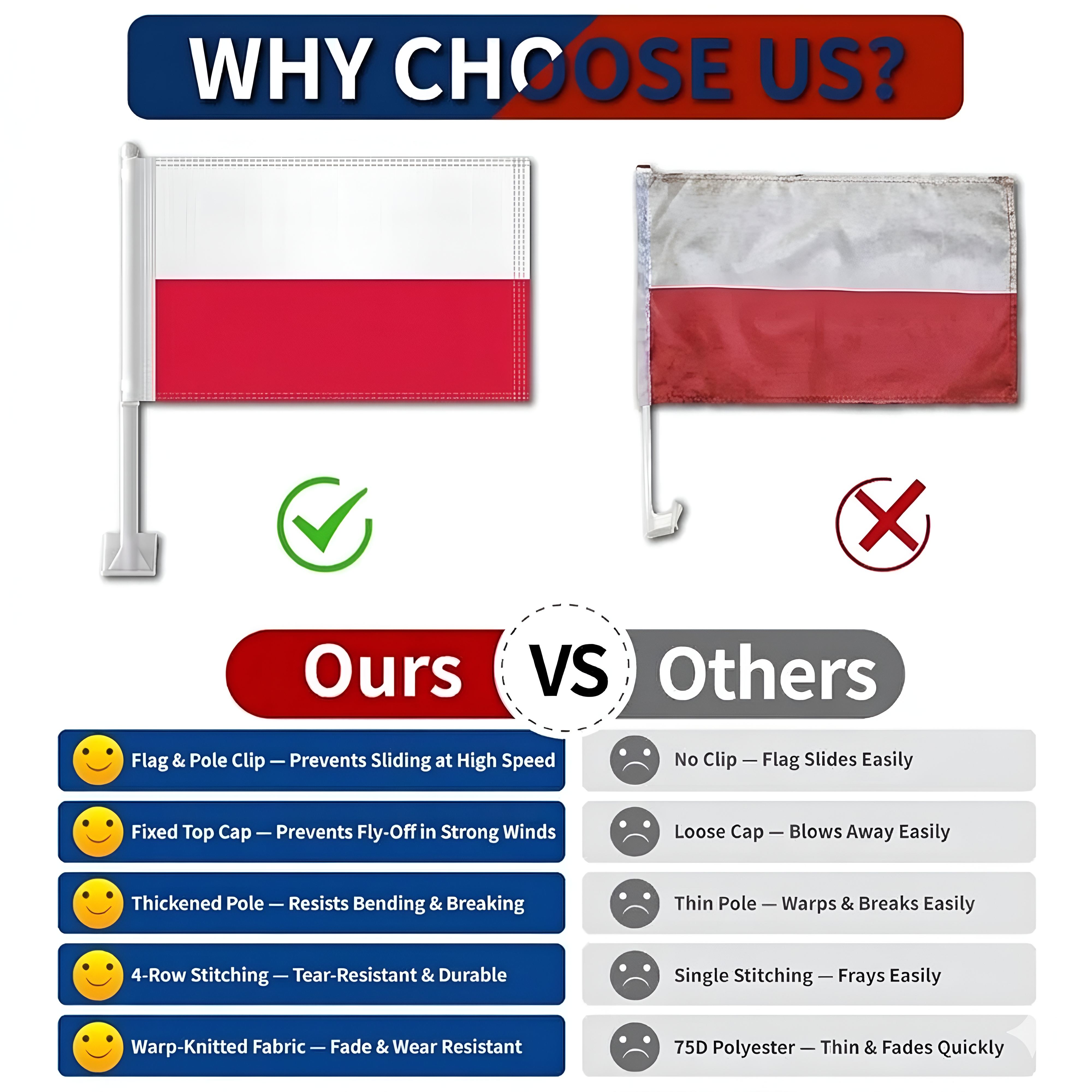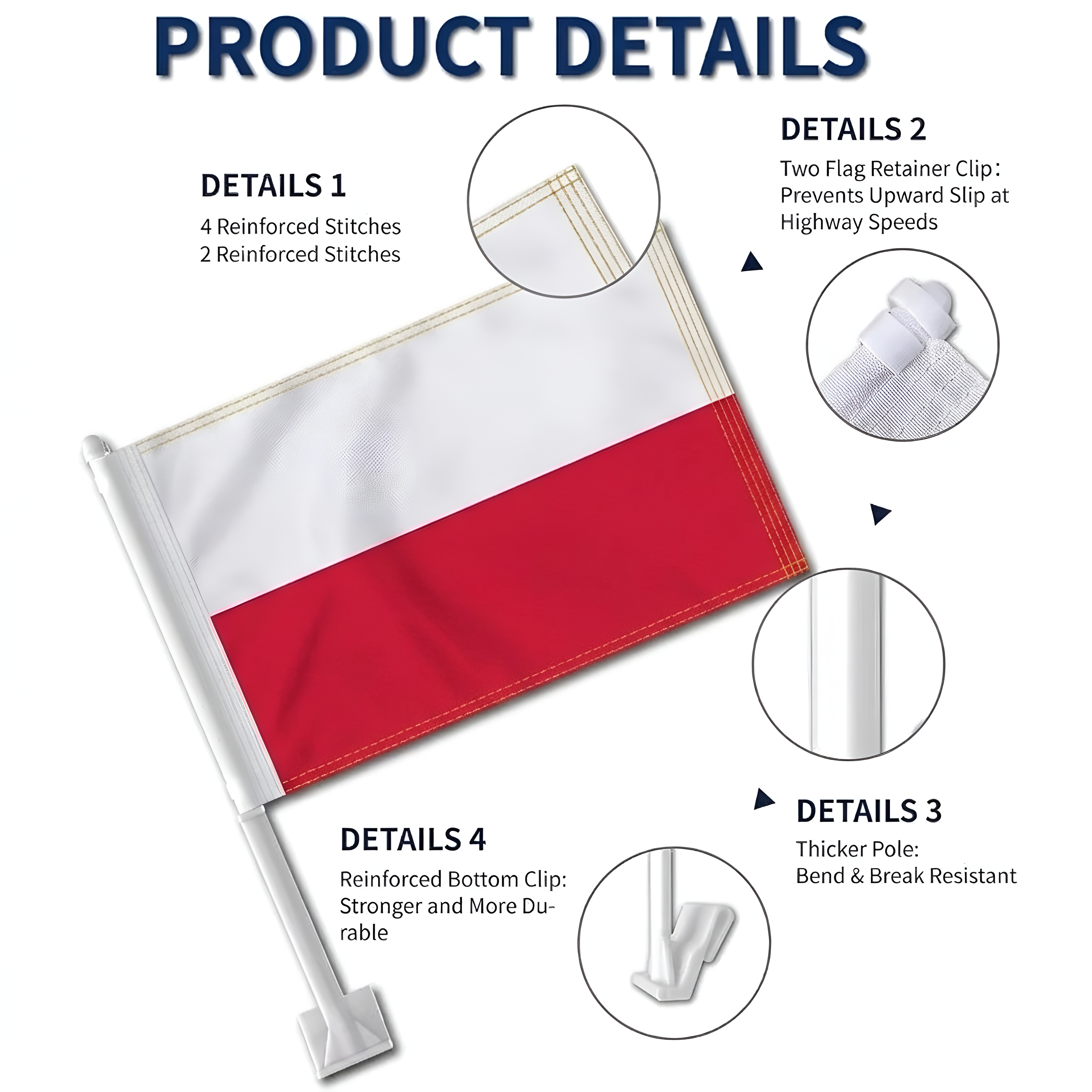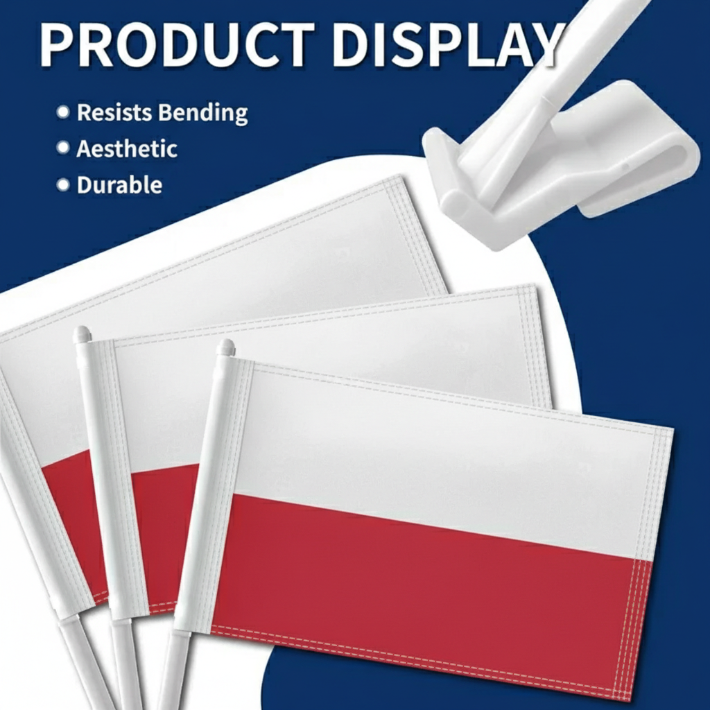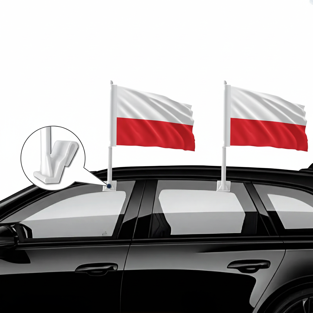 This set of two Official FIFA 2026 Poland Car Flag, sized 11 x 17 inches each, is prepared for display during daily driving, parades, sporting events, and national celebrations. Made with two-layer warp-knit polyester fabric, the construction provides added structure compared to standard lightweight materials. The double-sided printing allows the white and red design to appear correctly from both directions. Built to handle wind movement during driving and varying outdoor conditions, the structure supports repeated outdoor display. A reinforced window clip mounting system allows stable placement without tools, making setup quick and convenient. The thicker support pole helps maintain steady positioning while the vehicle is in motion. Suitable for cars, SUVs, and trucks, the compact flag format works for event display and everyday vehicle decoration.