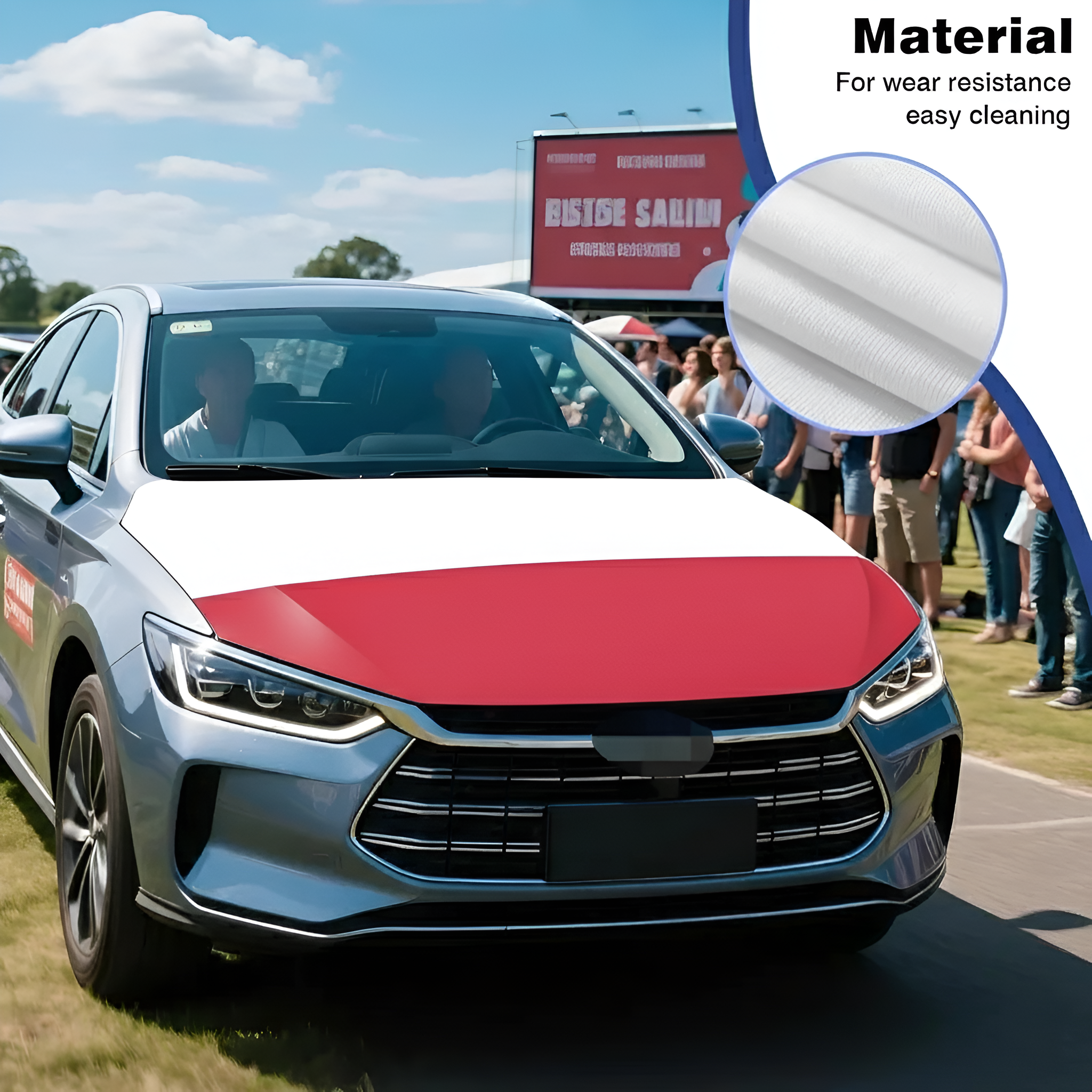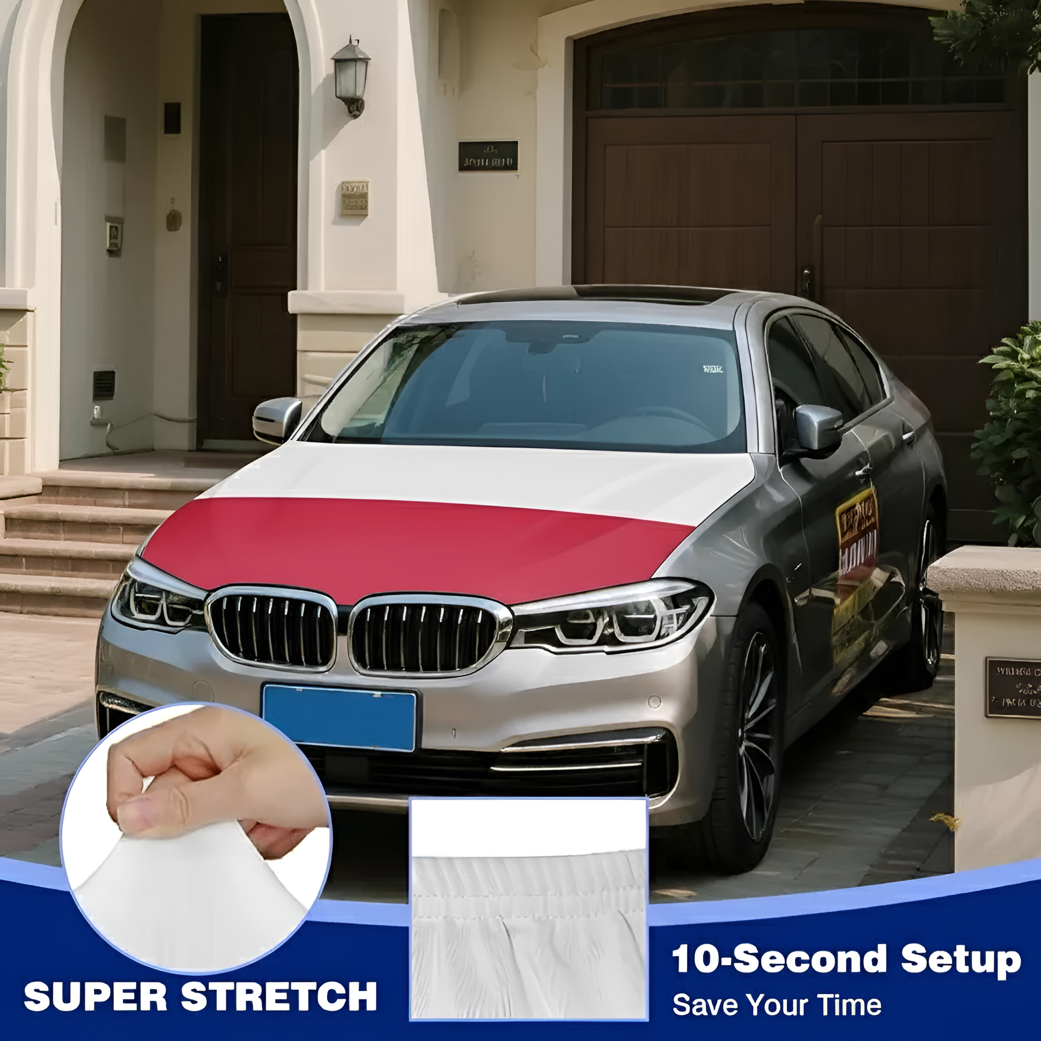 This Official FIFA 2026 Poland Flag Car Hood Cover is prepared to display the national flag design across the hood area while providing surface coverage during everyday driving. Measuring approximately 4 x 5 feet, the size supports compatibility with many cars, trucks, and SUVs. The cover is made from stretch polyester fabric that adapts to the hood shape and helps maintain a smooth appearance during regular vehicle use. The printed white and red design remains clearly visible across the fabric surface. The flexible material allows quick placement and removal while maintaining a stable position during normal driving conditions.