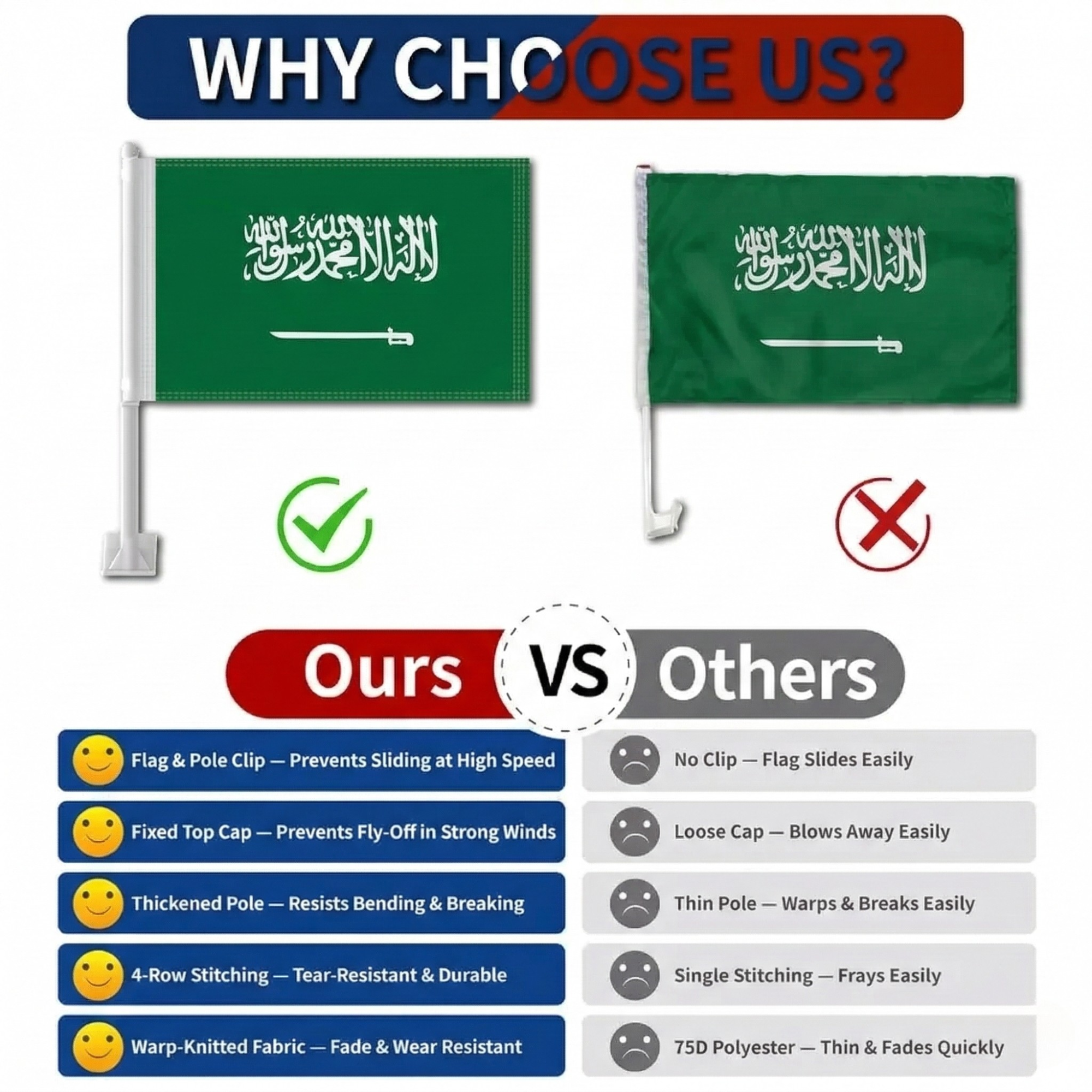 Suitable for cars, SUVs, and trucks, this compact vehicle flag format works well for sports gatherings, parades, celebrations, and decorative vehicle display.