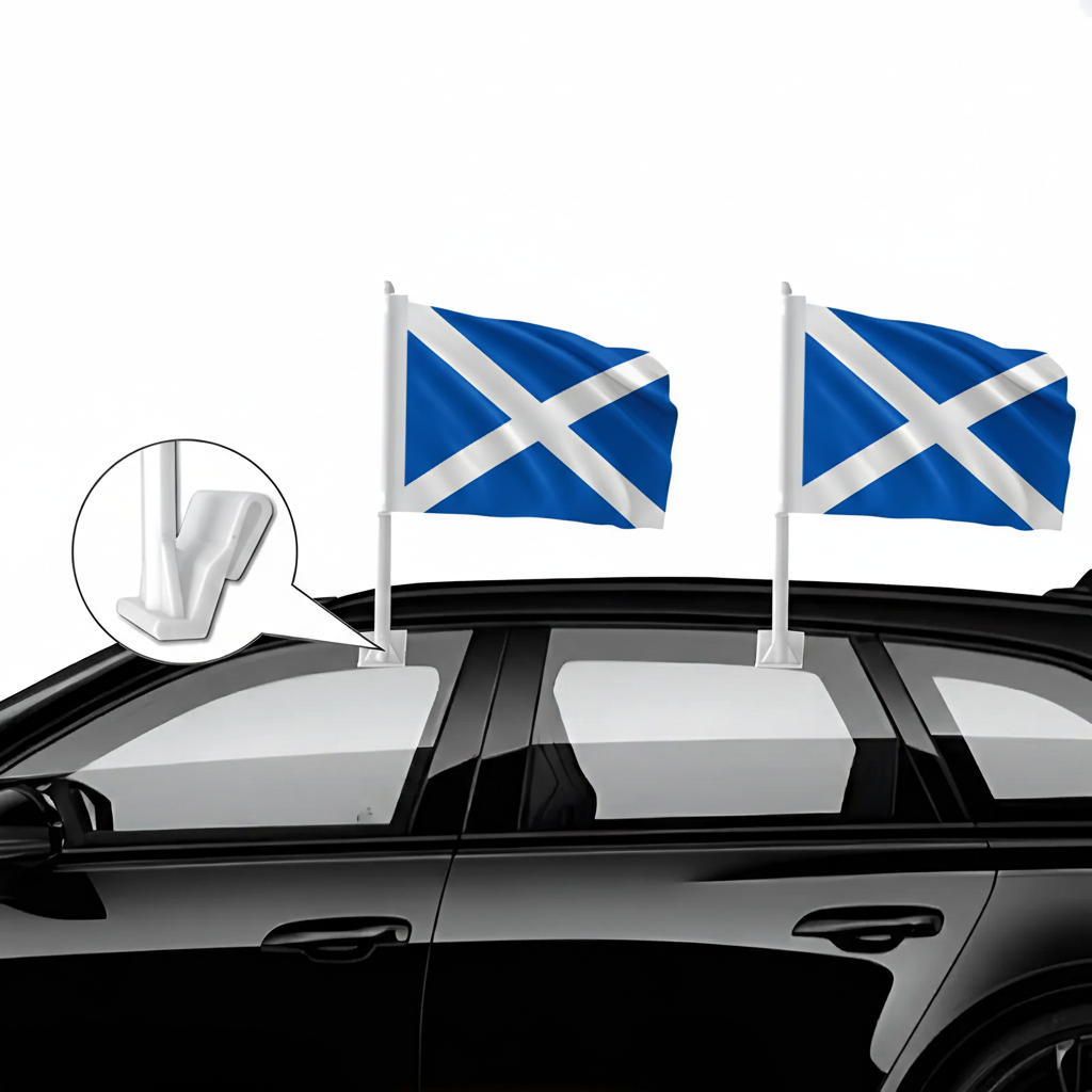 The Official FIFA 2026 Scotland Car Flag set is designed to present Scotland’s national colors while driving, attending parades, sporting events, or public celebrations. Each flag measures 11 x 17 inches and mounts to vehicle windows to create a visible display during travel.