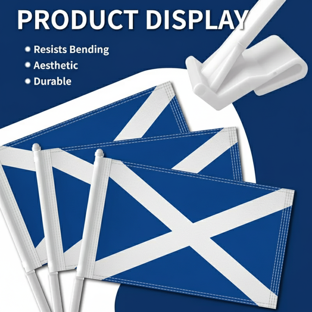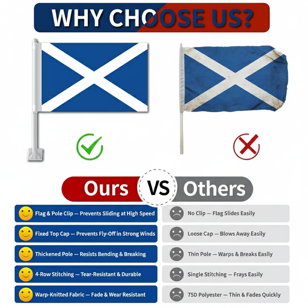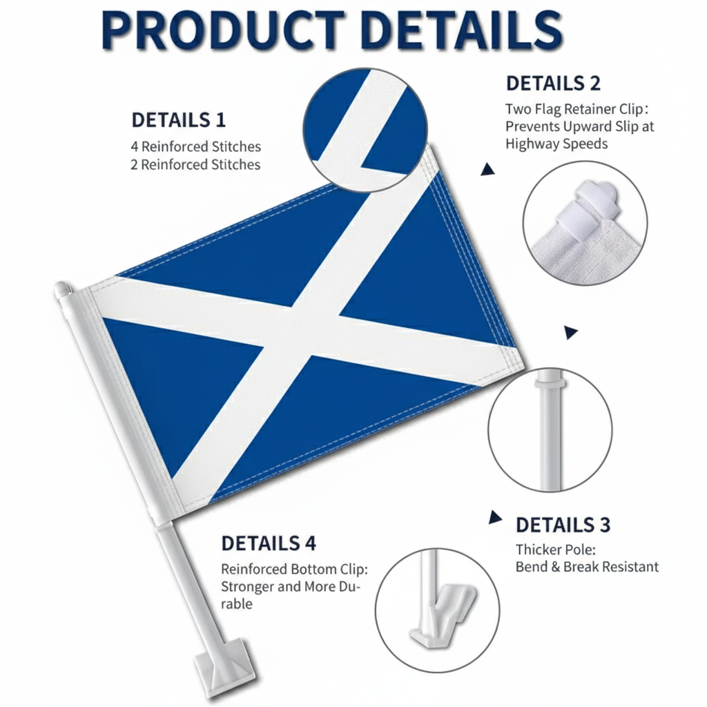A reinforced window clip system allows quick placement without tools. The thicker support pole helps maintain steady positioning during movement, keeping a neat display on vehicles. Suitable for cars, SUVs, and trucks, this flag set provides a practical decoration for national events and everyday driving.
