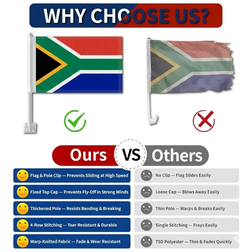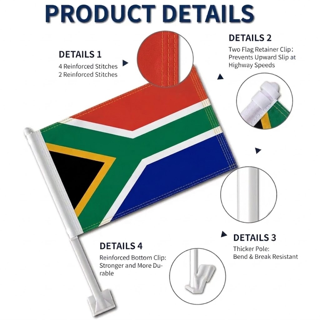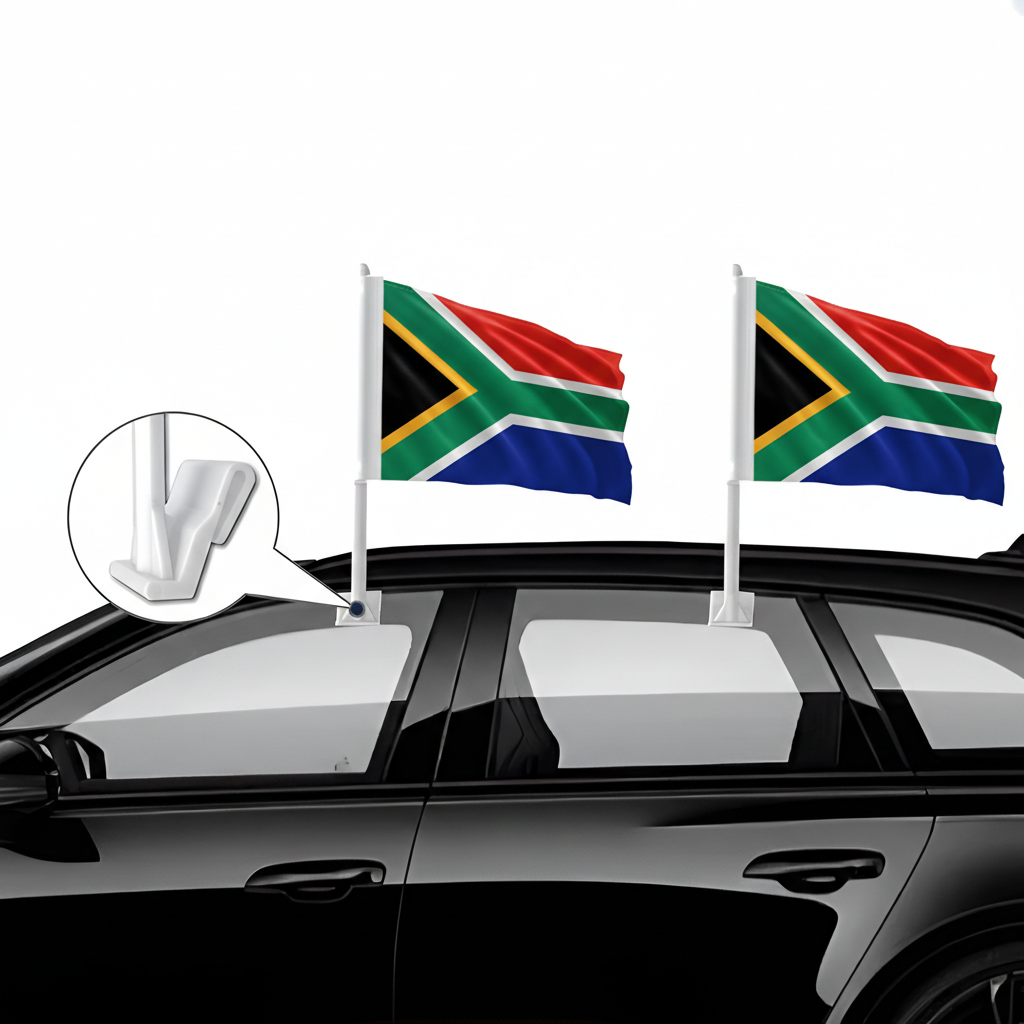 Celebrate the excitement of the international football tournament with the Official FIFA 2026 South Africa Car Flag, designed for supporters who want to display their national colors while on the road. Featuring the recognizable South African design with bold green, red, blue, black, yellow, and white elements, this flag creates a vibrant visual that stands out during match days and fan celebrations. The lightweight fabric moves smoothly in the wind, adding lively motion to your vehicle during drives, parades, and supporter gatherings. A sturdy pole with a window clip base allows quick attachment and simple removal when needed.
