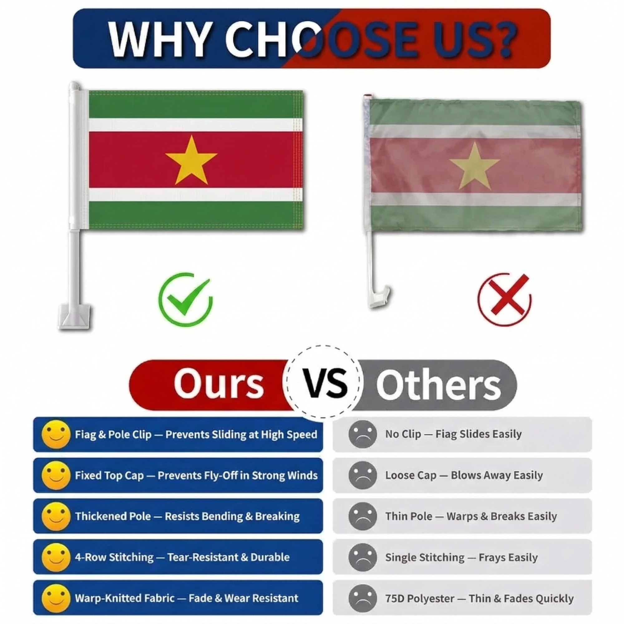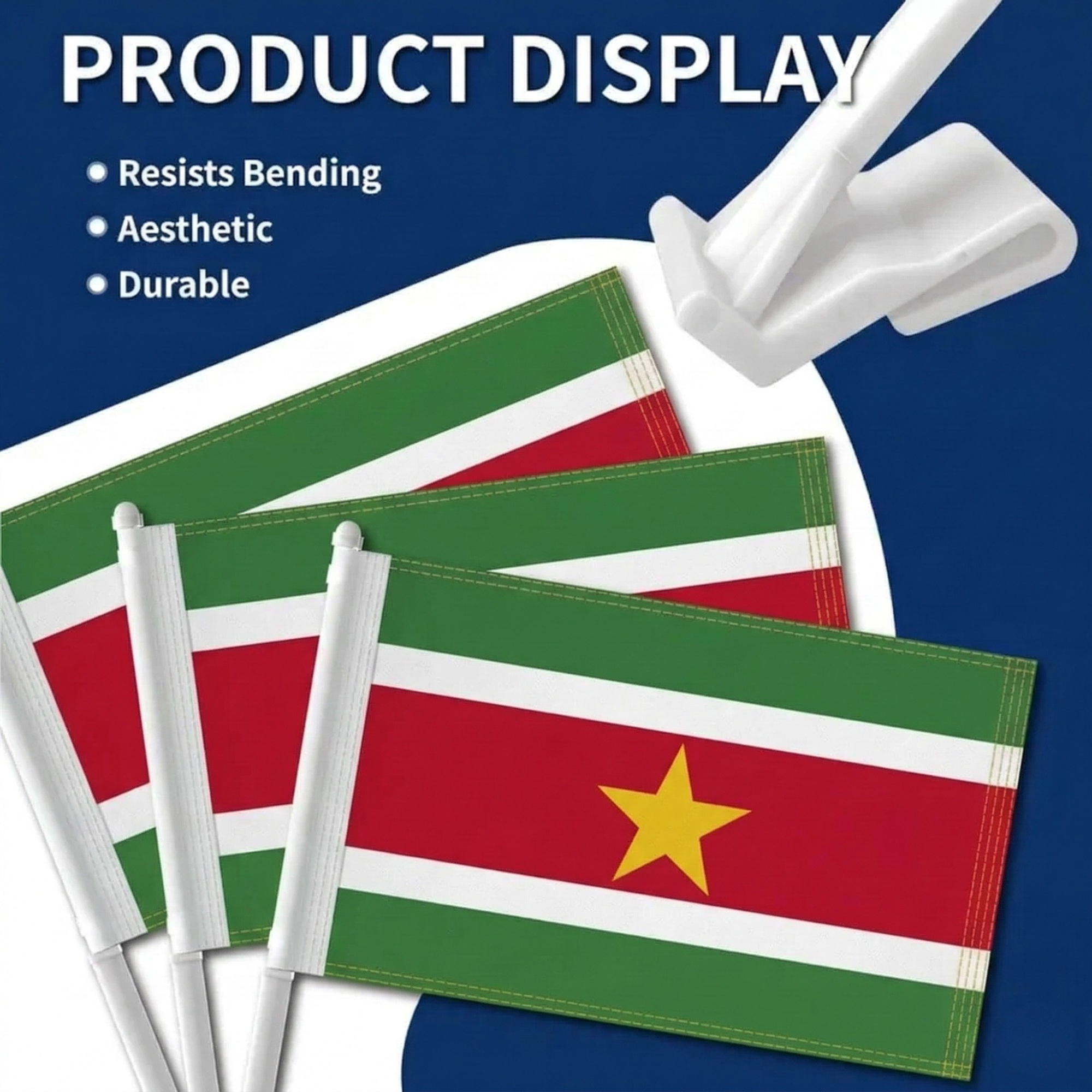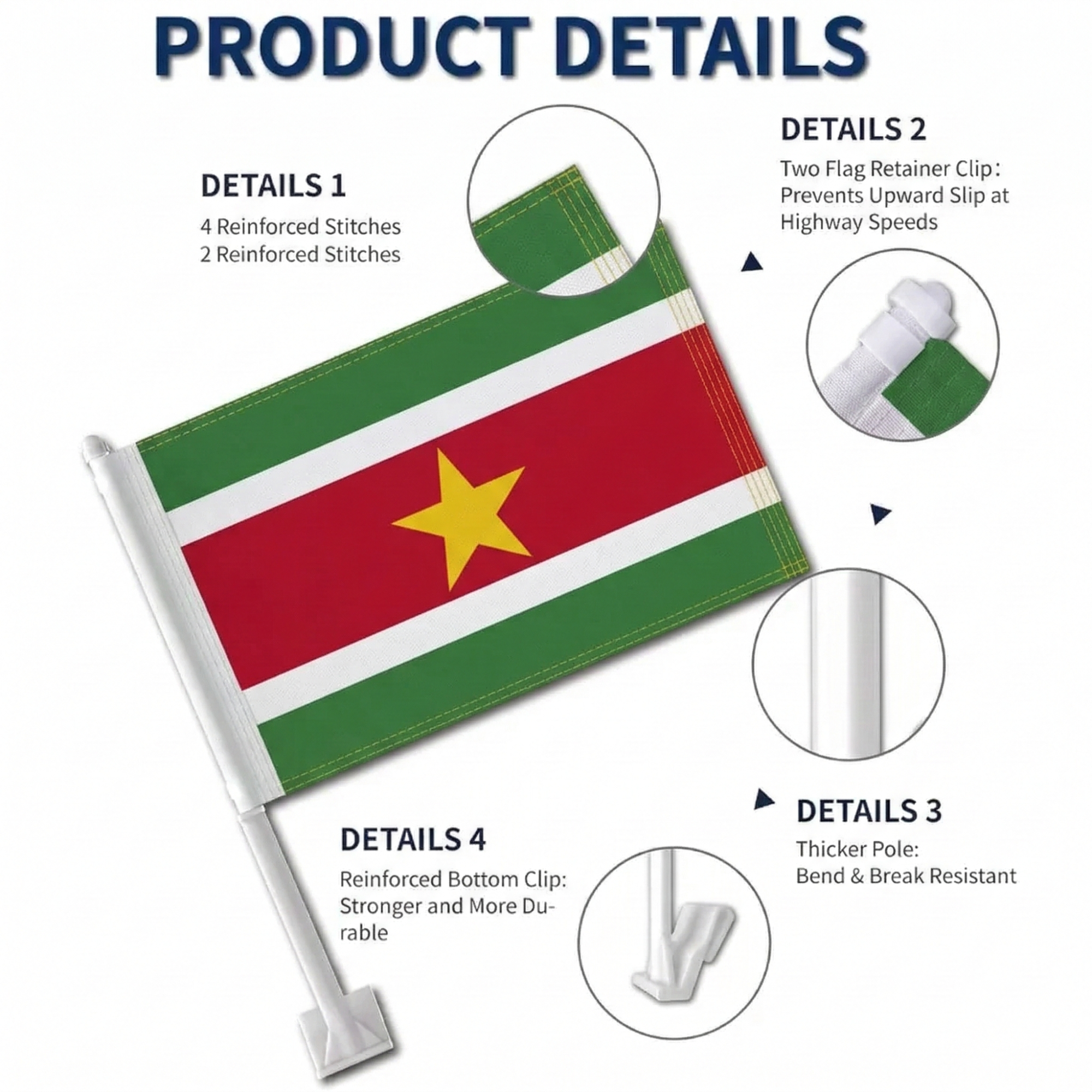 The Official FIFA 2026 Suriname Car Flag is designed for vehicle window display during sporting gatherings, parades, and national celebrations. Each flag measures 11 × 17 inches and is made from two-layer warp-knit polyester that provides structure compared with lightweight fabric.