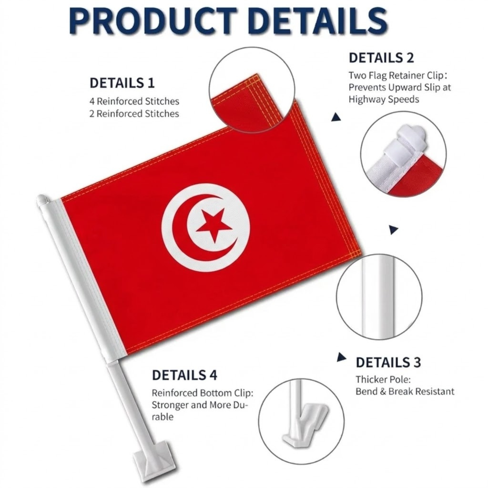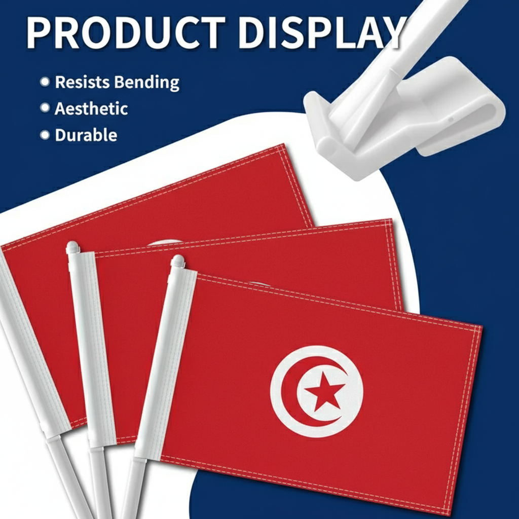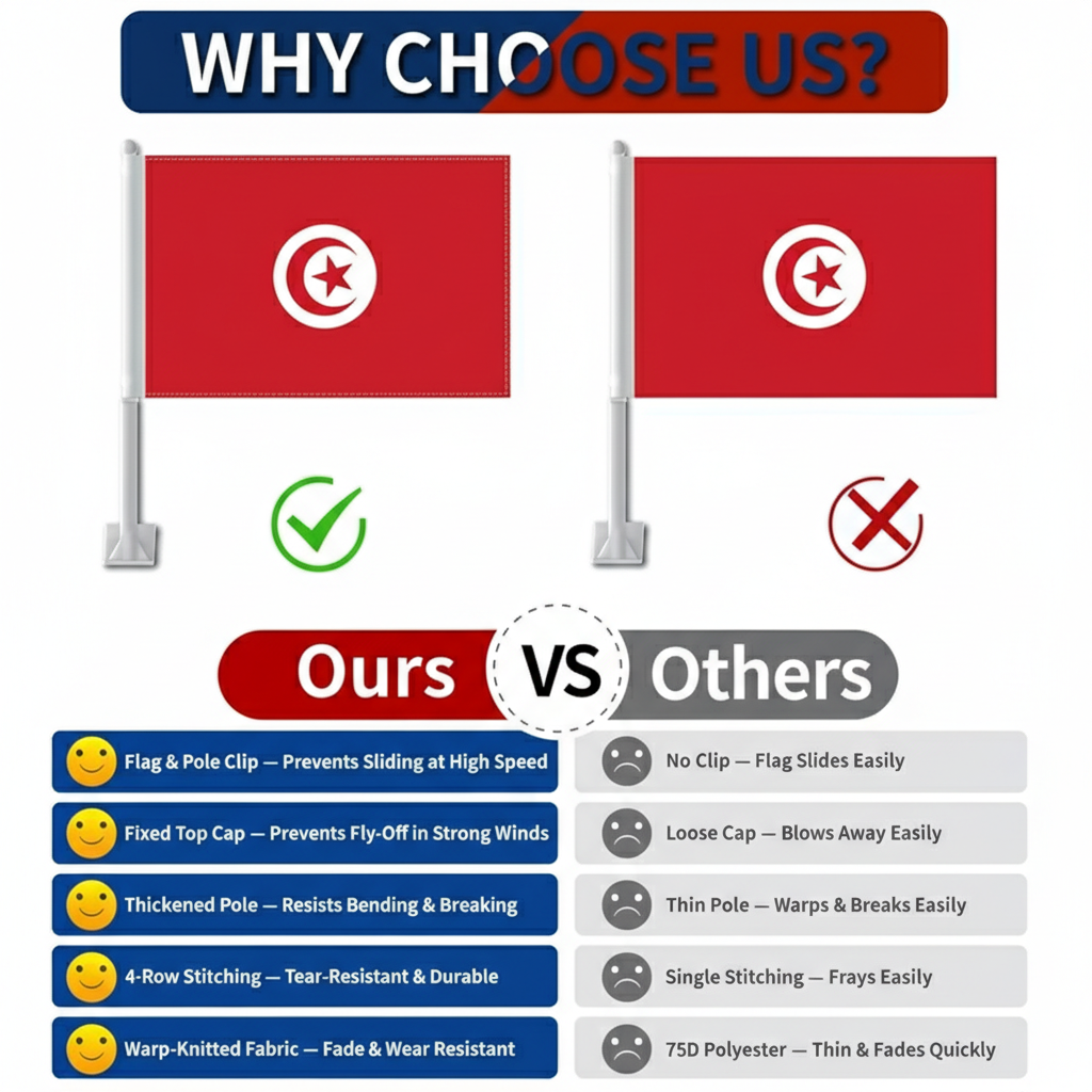 This set of two Official FIFA 2026 Tunisia Car Flag, sized 11 x 17 inches each, is designed for displaying national pride during daily driving, parades, sporting events, and patriotic celebrations. Made from two-layer warp-knit polyester, the fabric provides improved structure compared to standard lightweight materials. The double-sided printing ensures the red and white design with crescent and star appears clear and correctly oriented from both directions. Built to handle road wind and changing weather conditions, the construction supports consistent outdoor display. A reinforced window clip system allows stable attachment without tools, making installation quick and convenient.