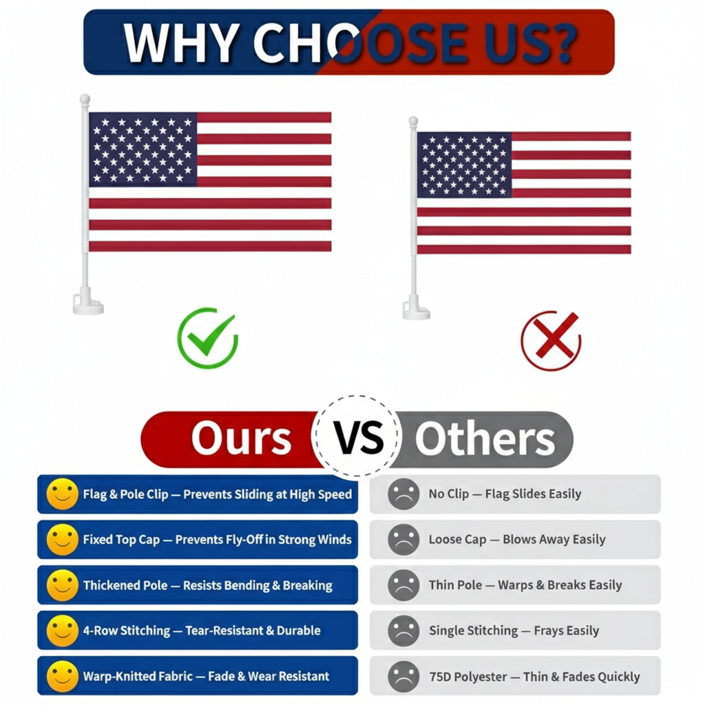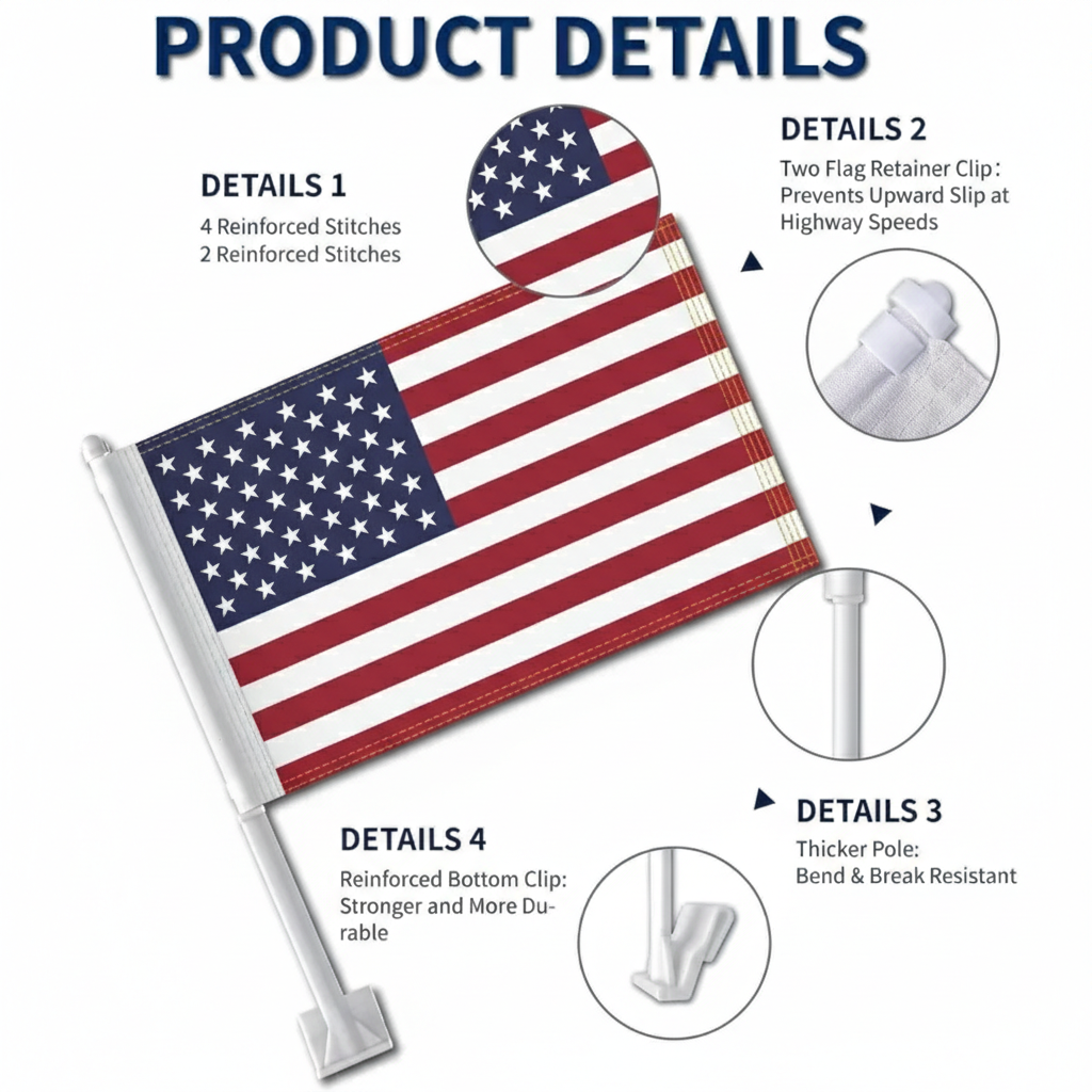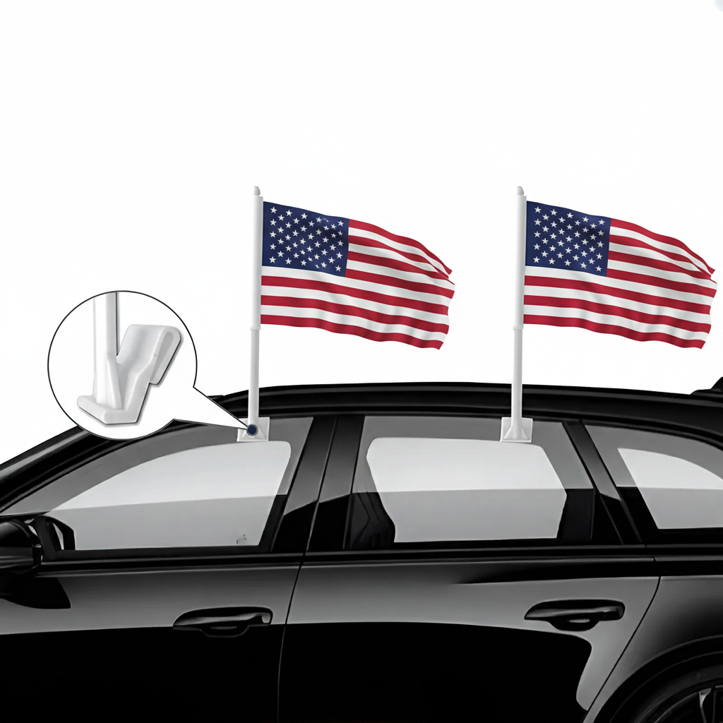 A reinforced window clip system allows quick placement without tools. The thicker support pole helps maintain steady positioning during movement, keeping a neat vehicle display. Suitable for cars, SUVs, and trucks, this flag set serves as a practical decoration for national events and everyday driving.