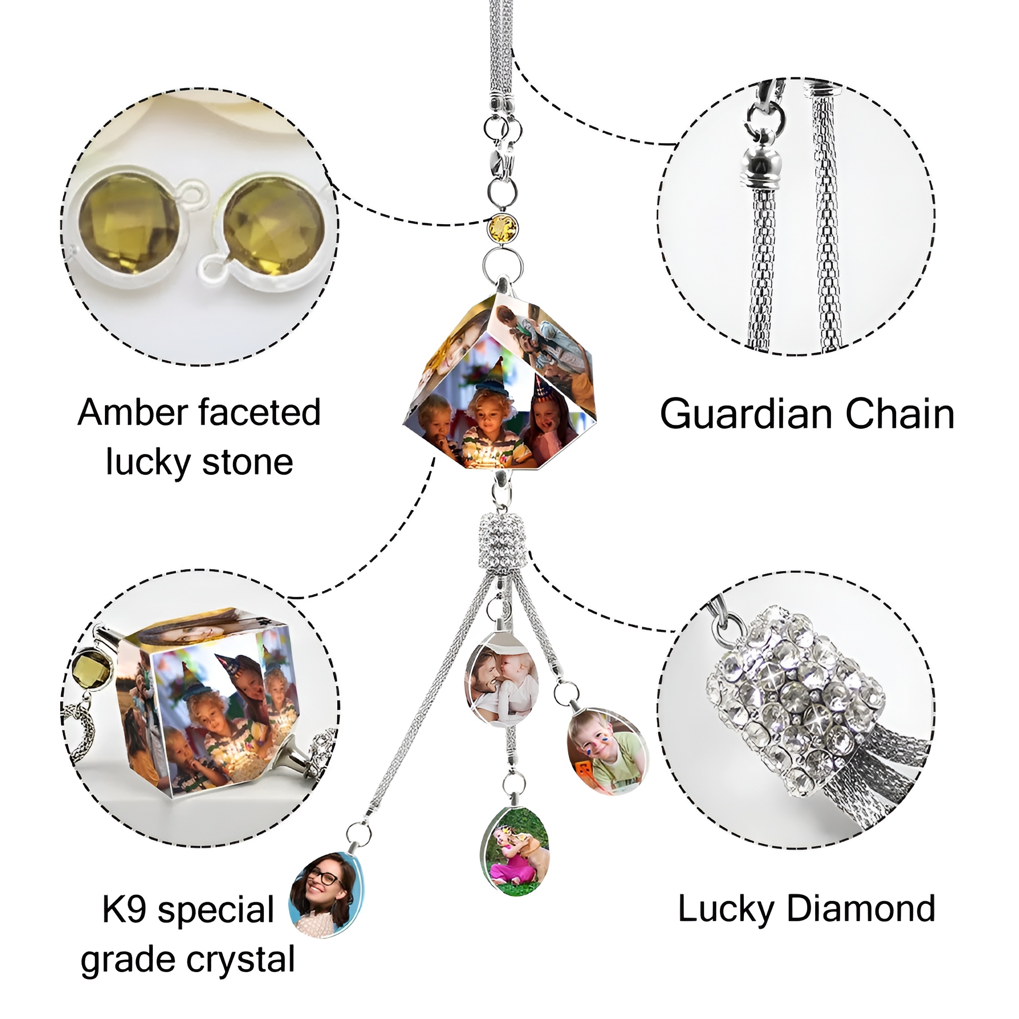 The pendant can be displayed from a vehicle mirror, shelf hook, or decorative stand. Its transparent crystal structure highlights the selected image while the small charm pieces below add additional detail with miniature pictures.