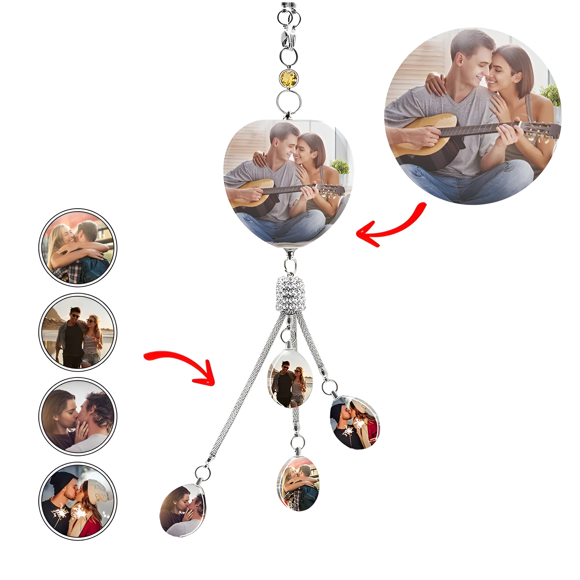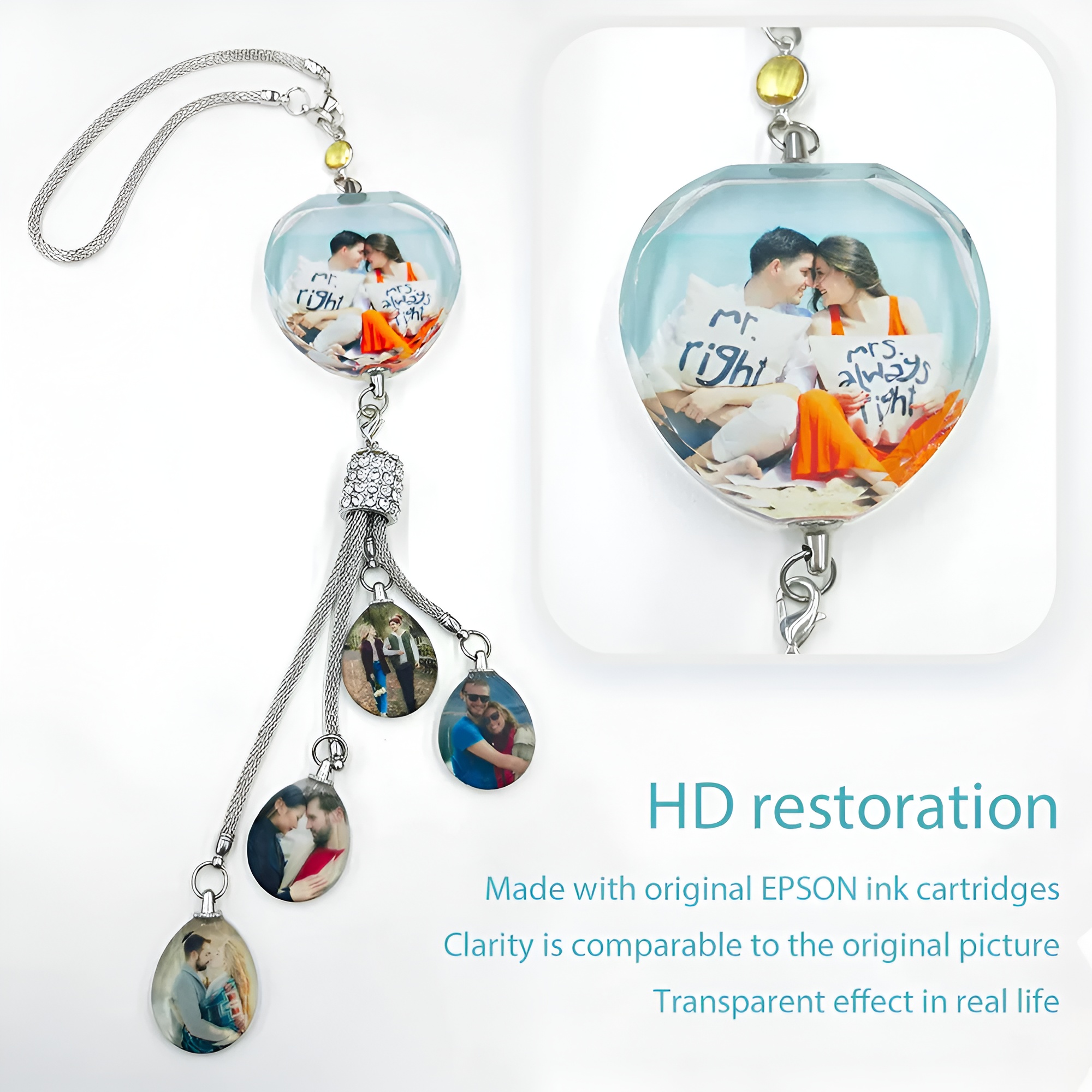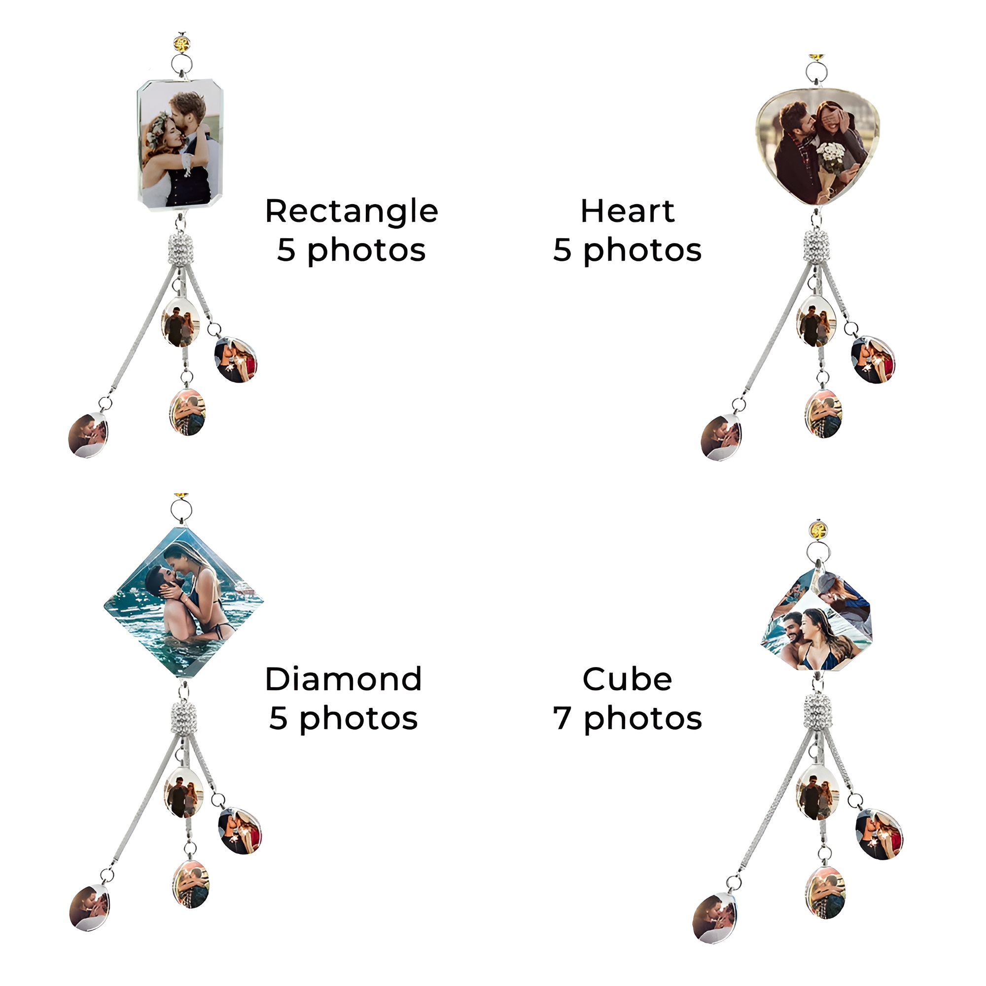 The hanging charm section can include up to four small images for extra personalization.