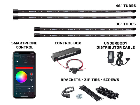 OneUpLighting proudly introduces the latest in underbody lighting kits. The Underglow-X features custom smartphone control. Our kits come with a specialized silicone layer that makes them fully waterproof and weather-resistant! Experience ultra-bright, multi-color RGBW LED lighting that is guaranteed to give your ride a one-of-a-kind look.