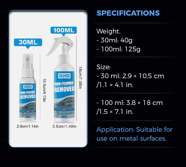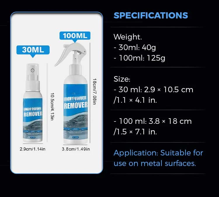 - Package includes 1 bottle of Rust Removing Spray. Note: Please allow for slight measurement errors due to manual measuring.