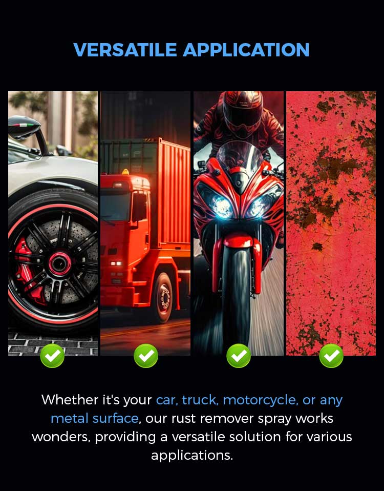 Revitalize your metal surfaces with our Rust Removing Spray, designed to tackle rust stains and particles effortlessly. Here's what makes it stand out: